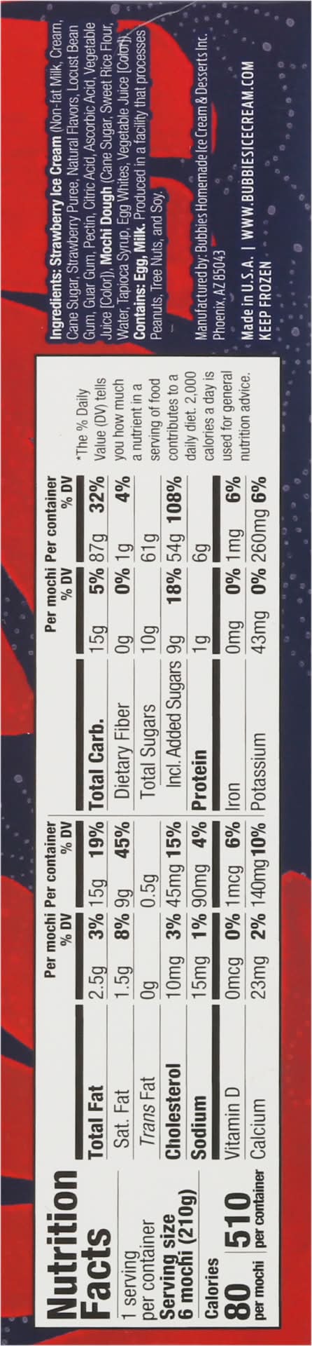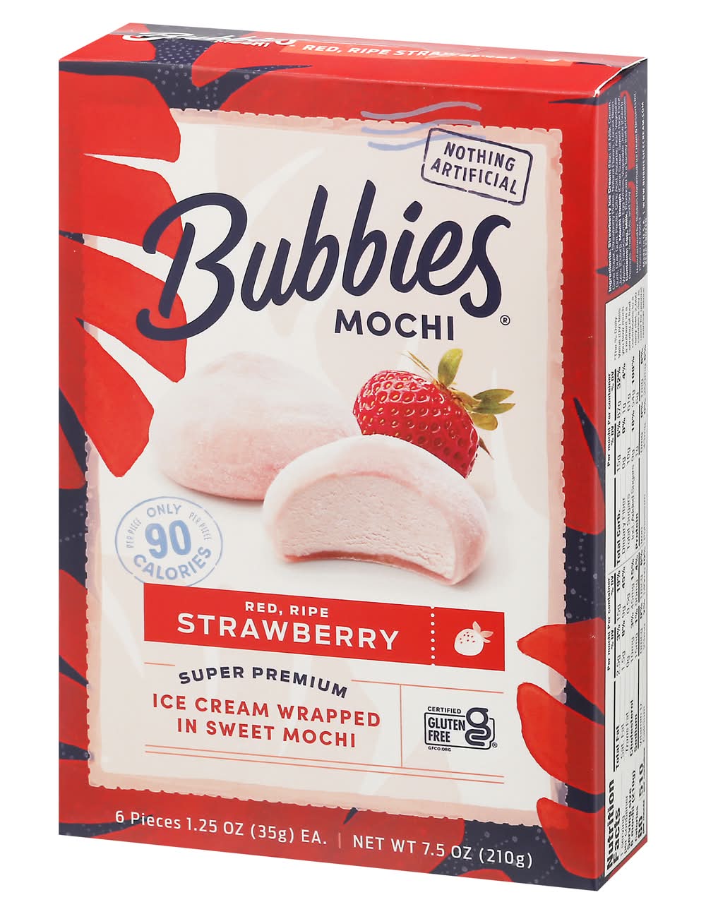 Ice cream wrapped in sweet mochi. Nothing artificial. Surprisingly soft, delightfully chewy mochi. Rich, creamy super premium ice cream. And with the best ingredients, the highest standards, and just the right amount of real red ripe strawberry in every bite, each piece is a perfectly portioned ticket. Let’s go. No rBST (Milk from cows not treated with rBST. No significant difference has been shown between milk derived from rBST treated and non rBST treated cows). • Flavor: Red, ripe strawberry • Pack size: 6 • Bubbies Homemade Ice Cream & Desserts Inc., Phoenix, AZ, 85043 • Packaging: Reusable