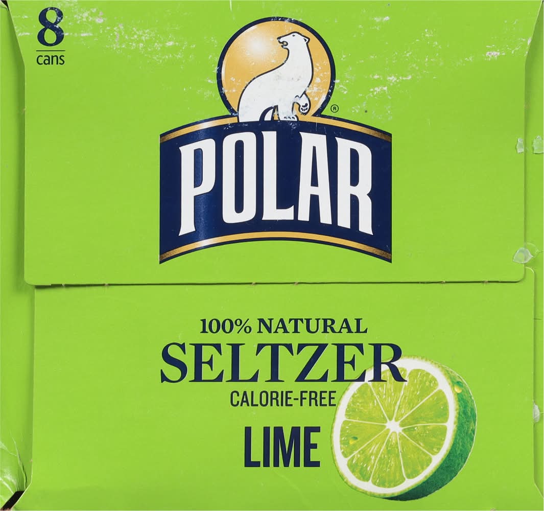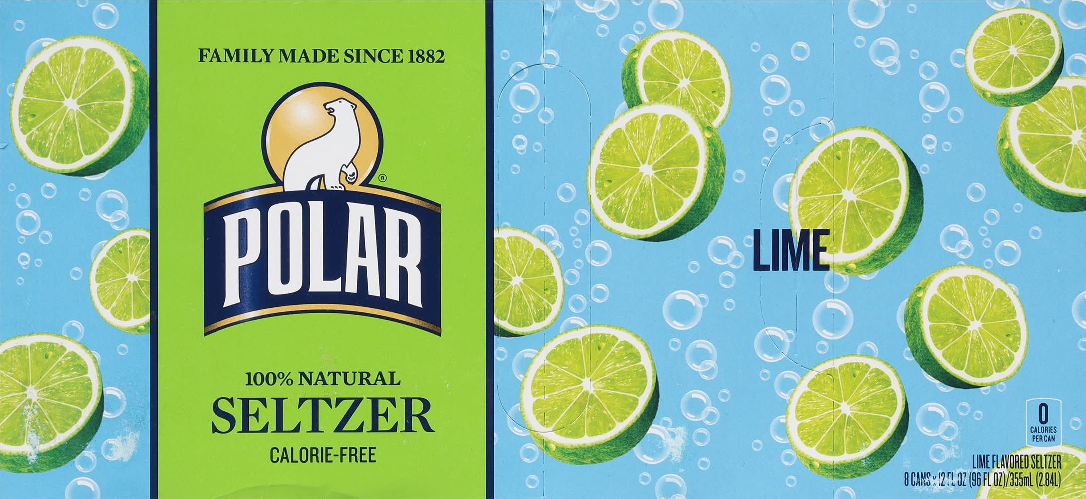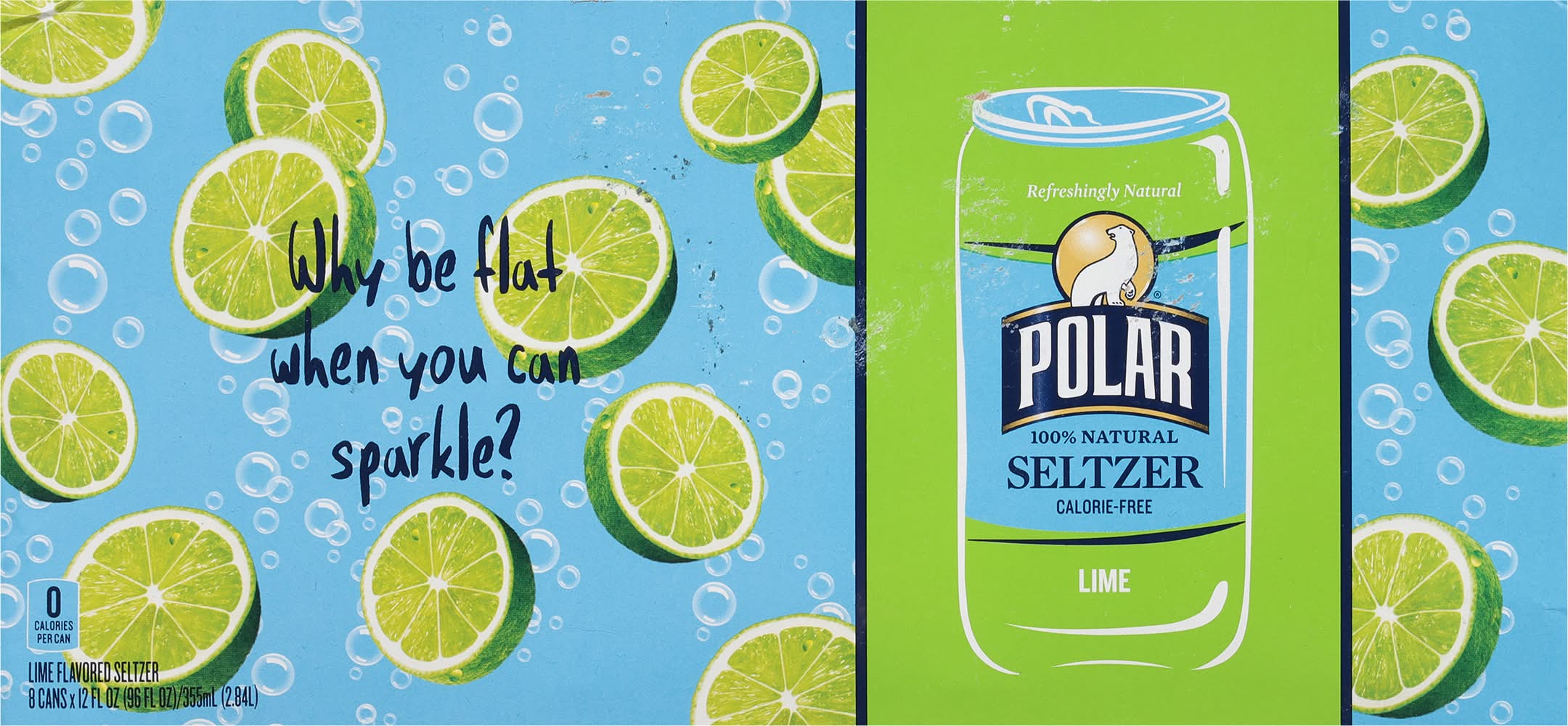 Lime flavored seltzer. 0 calories per can. We craft our seltzer with no sugar, sweeteners, sodium or caffeine, and they are vegan and gluten-free. Calorie-free. Family made since 1882. 100% natural. Why be flat when you can sparkle? (hashtag)PolarSeltzer. • Flavor: Lime • Pack size: 8 • Number of servings: 8 • Packaging: Reusable