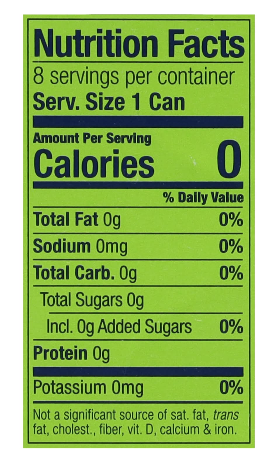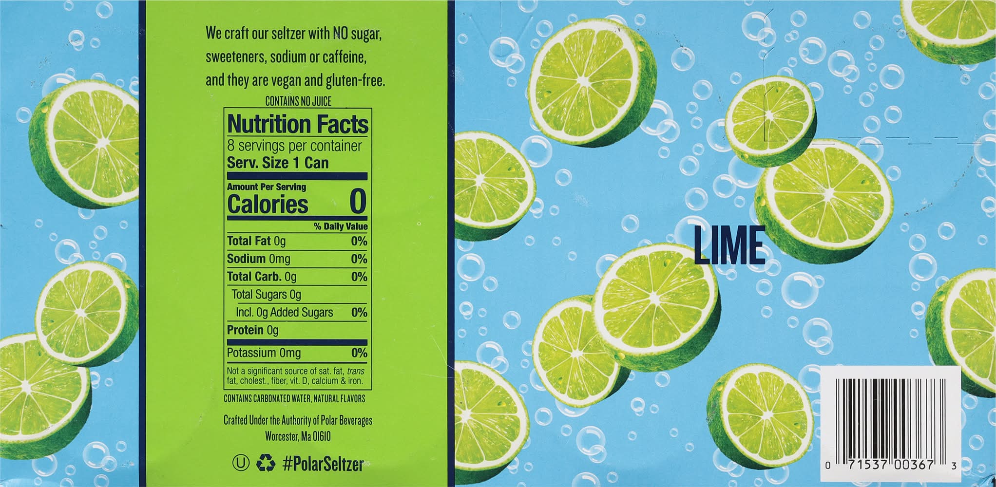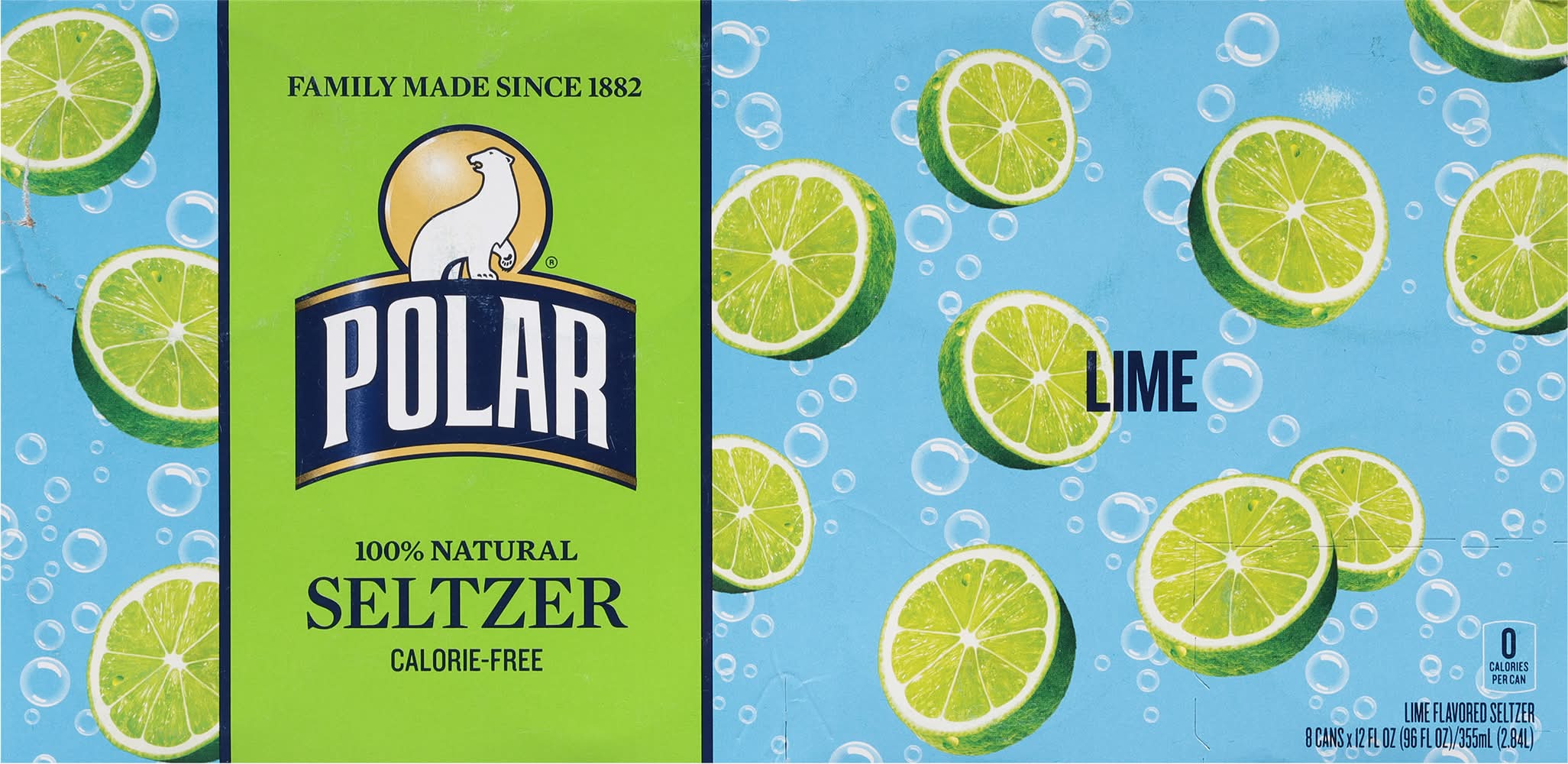 Lime flavored seltzer. 0 calories per can. We craft our seltzer with no sugar, sweeteners, sodium or caffeine, and they are vegan and gluten-free. Calorie-free. Family made since 1882. 100% natural. Why be flat when you can sparkle? (hashtag)PolarSeltzer. • Flavor: Lime • Pack size: 8 • Number of servings: 8 • Packaging: Reusable