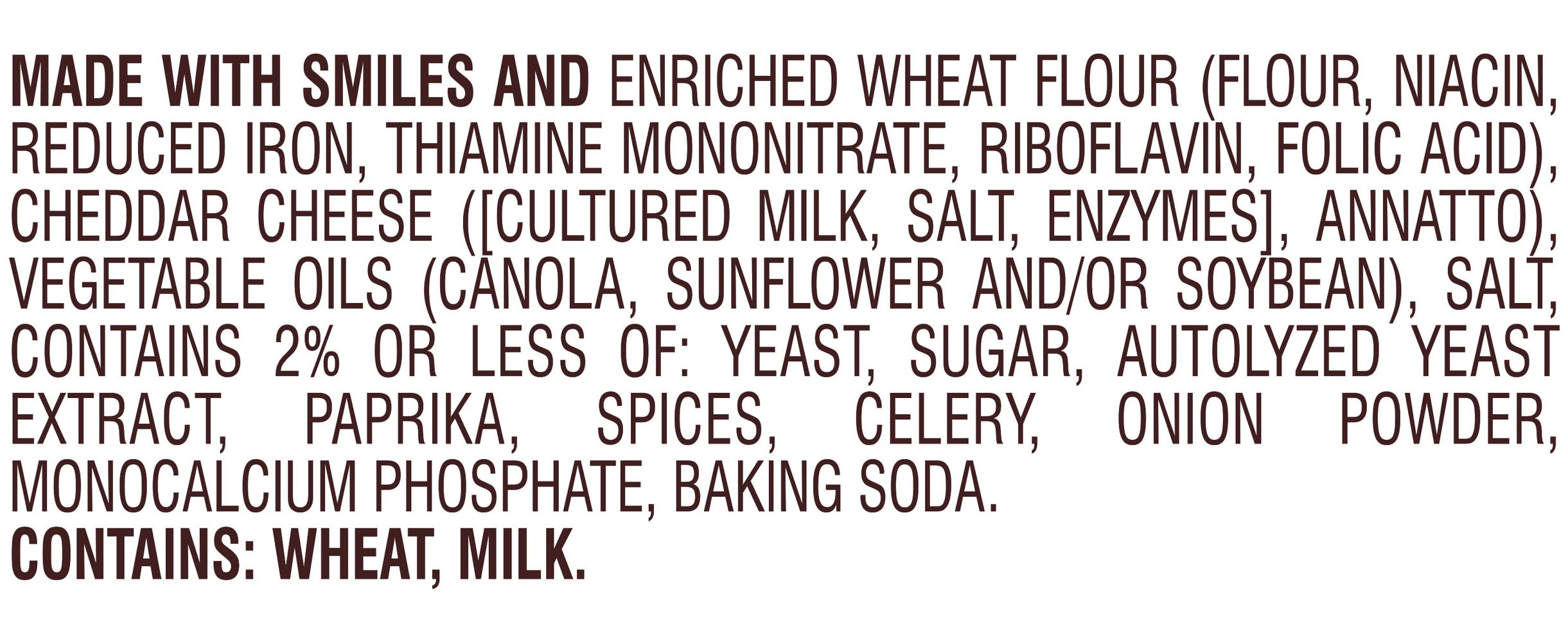 Ingredients: MADE WITH SMILES AND ENRICHED WHEAT FLOUR (FLOUR, NIACIN, REDUCED IRON, THIAMINE MONONITRATE, RIBOFLAVIN, FOLIC ACID), CHEDDAR CHEESE ([CULTURED MILK, SALT, ENZYMES], ANNATTO), VEGETABLE OILS (CANOLA, SUNFLOWER AND/OR SOYBEAN), SALT, CONTAINS 2% OR LESS OF: YEAST, SUGAR, AUTOLYZED YEAST EXTRACT, PAPRIKA, SPICES, CELERY, ONION POWDER, MONOCALCIUM PHOSPHATE, BAKING SODA. CONTAINS: WHEAT, MILK. Contains: Wheat, Milk, Soybeans