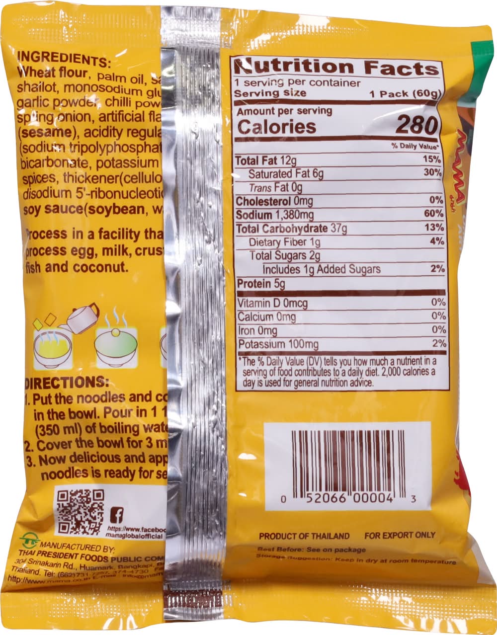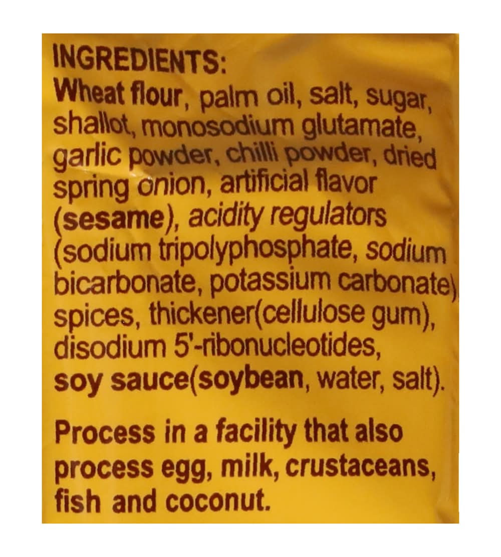Ingredients: Wheat Flour, Palm Oil, Salt, Sugar, Shallot, Monosodium Glutamate, Garlic Powder, Chilli Powder, Dried Spring Onion, Artificial Flavor (Sesame), Acidity Regulators (Sodium Tripolyphosphate, Sodium Bicarbonate, Potassium Carbonate), Spices, Thickener (Cellulose Gum), Disodium 5'-Ribonucleotides, Soy Sauce (Soybean, Water, Salt) Contains: Wheat, Sesame, Soybeans, Eggs, Milk, Crustacean Shellfish, Fish, Tree Nuts, Coconuts
