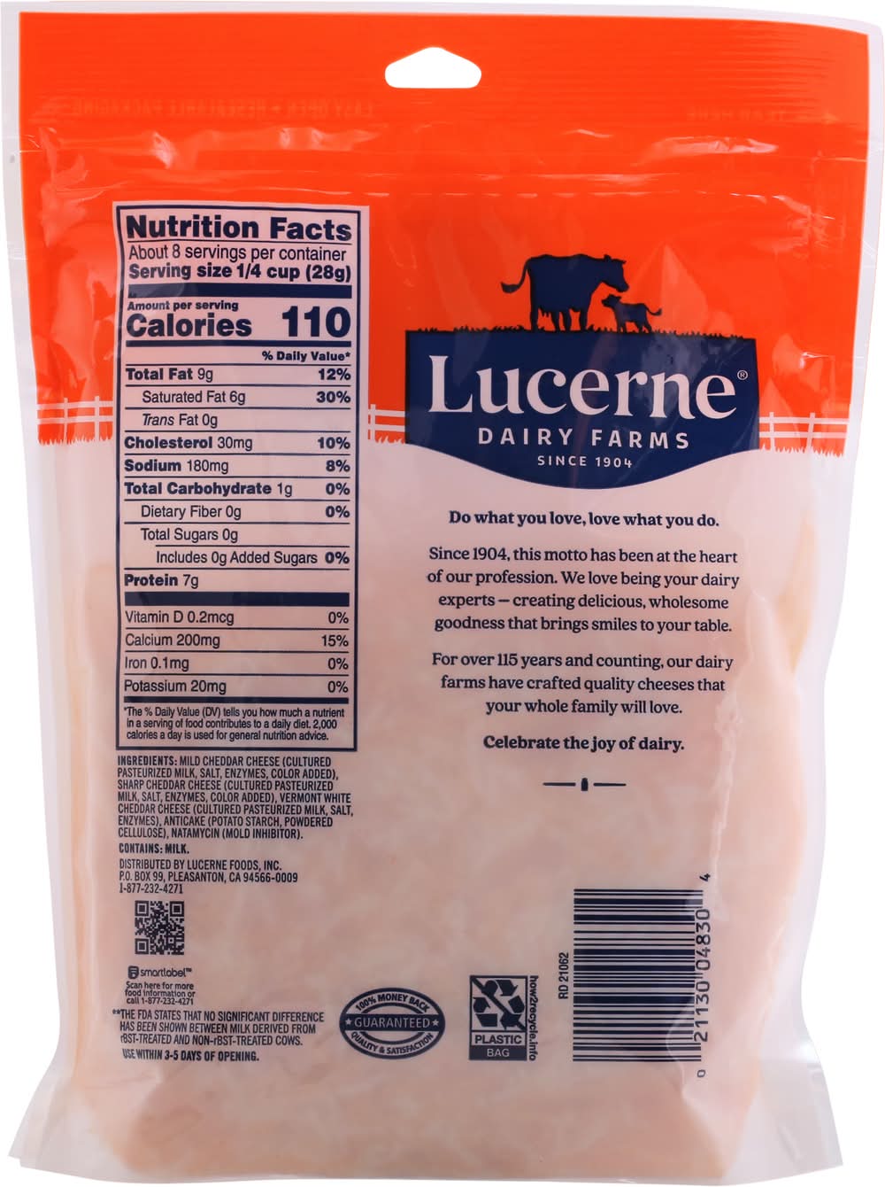 Package of premium cheese blend. It contains a mix of finely shredded cheddar cheeses, perfect for adding a rich and creamy texture to your favorite dishes. • Number of servings: 8 • Lucerne Foods, Inc., Pleasanton, CA, 94566-0009, Ph: 877-232-4271 • Packaging: Reusable