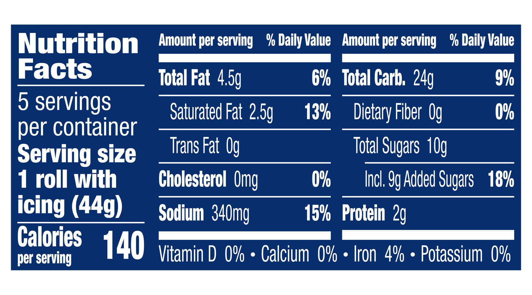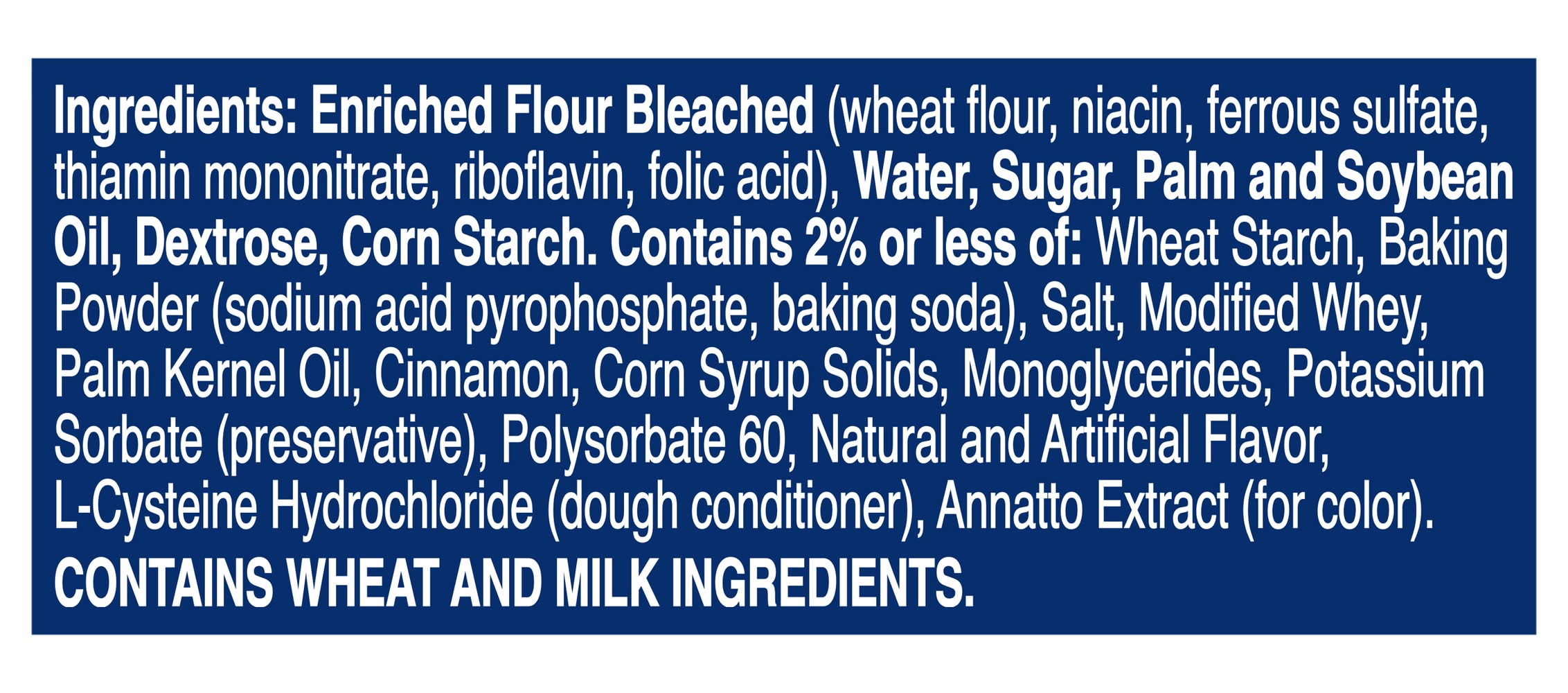 Ingredients: Enriched Flour Bleached (Wheat Flour, Niacin, Ferrous Sulfate, Thiamin Mononitrate, Riboflavin, Folic Acid), Water, Sugar, Palm and Soybean Oil, Dextrose, Corn Starch. Contains 2% or Less of: Wheat Starch, Baking Powder (Sodium Acid Pyrophosphate, Baking Soda), Salt, Modified Whey, Palm Kernel Oil, Cinnamon, Corn Syrup Solids, Monoglycerides, Potassium Sorbate (Preservative), Polysorbate 60, Natural and Artificial Flavor, L-Cysteine Hydrochloride (Dough Conditioner), Annatto Extract (for Color) Contains: Wheat, Milk, Soybeans
