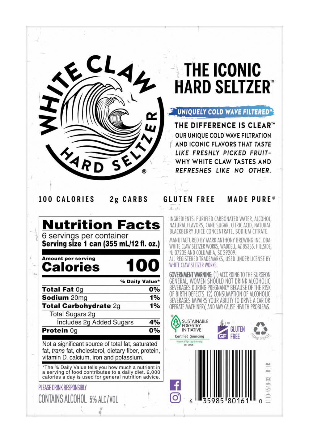 Enjoy a refreshing experience with White Claw Hard Seltzer, featuring a subtle hint of black cherry flavor. This hard seltzer is crafted through a unique BrewPure process, utilizing only the finest natural flavors to ensure a pure and enjoyable taste. • Flavor: Black cherry • Pack size: 6 • Alcohol by volume: 5% • Mark Anthony Brewing Inc., Chicago IL 60661