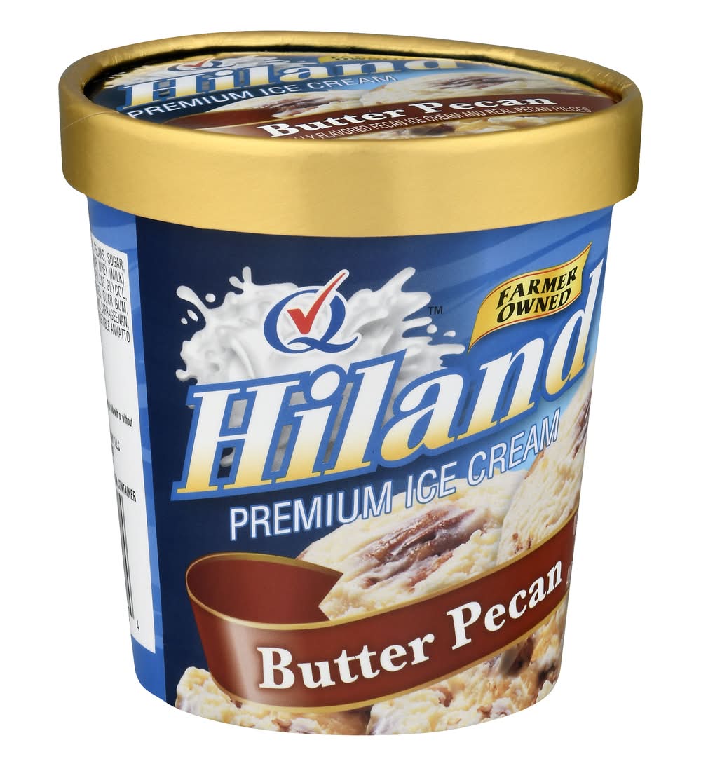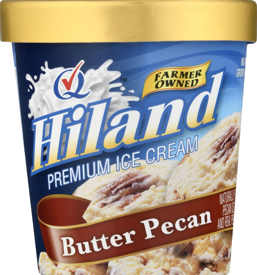 Naturally flavored pecan ice cream and real pecan pieces. No artificial growth hormones (The FDA states there is no difference in the quality or safety of milk with or without the use of rBST). www.hilanddairy.com. Farmer owned. Flavor: Butter pecan