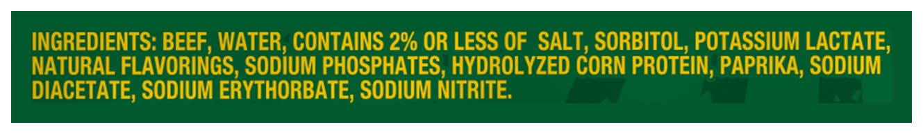Ingredients: Beef, Water, Contains 2% or Less of Salt, Sorbitol, Potassium Lactate, Natural Flavorings, Sodium Phosphates, Hydrolyzed Corn Protein, Paprika, Sodium Diacetate, Sodium Erythorbate, Sodium Nitrite Contains: Corn