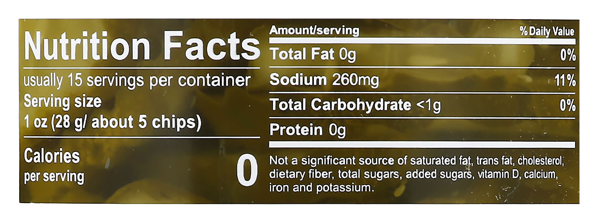 Ingredients: Cucumbers, Water, Vinegar, Sea Salt, Chloride (Firming Agent), Natural Flavors, Polysorbate 80, and Turmeric (for Color)