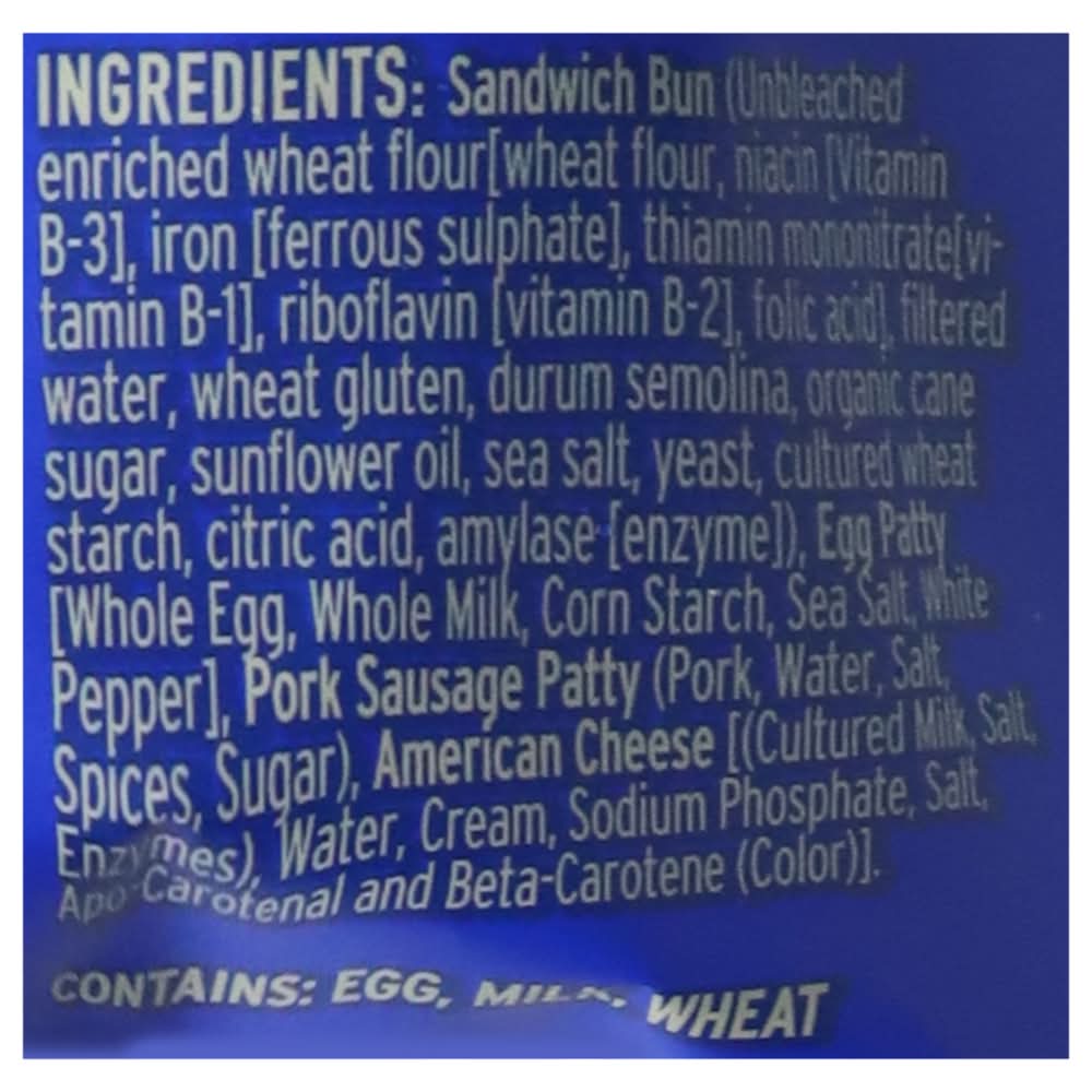 Ingredients: Sandwich Bun (Unbleached Enriched Wheat Flour [Wheat Flour, Niacin [Vitamin B-3], Iron [Ferrous Sulphate], Thiamin Mononitrate [Vitamin B-1], Riboflavin [Vitamin B-2], Folic Acid], Filtered Water, Wheat Gluten, Durum Semolina, Organic Cane Sugar, Sunflower Oil, Sea Salt, Yeast, Cultured Wheat Starch, Citric Acid, Amylase [Enzyme]), Egg Patty [Whole Egg, Whole Milk, Corn Starch, Sea Salt, White Pepper], Pork Sausage Patty (Pork, Water, Salt, Spices, Sugar), American Cheese [(Cultured Milk, Salt, Enzymes), Water, Cream, Sodium Phosphate, Salt, Apo-Carotenal and Beta-Carotene (Color)] Contains: Wheat, Gluten, Milk, Corn, Eggs