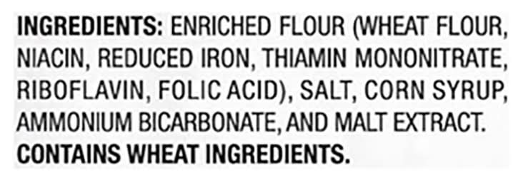 Ingredients: Enriched Flour (Wheat Flour, Niacin, Reduced Iron, Thiamin Mononitrate, Riboflavin, Folic Acid), Salt, Corn Syrup, Ammonium Bicarbonate, and Malt Extract Contains: Wheat