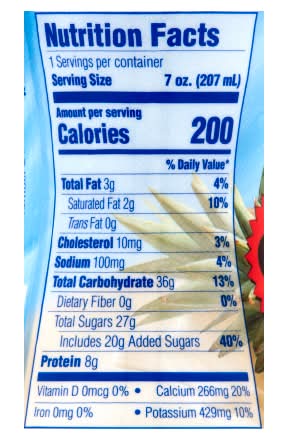 Ingredients: Cultured Grade A Milk, Sugar, Piña Colada Syrup (Natural Flavor, Water, Sugar, Modified Food Starch, Citric Acid, Potassium Sorbate (to maintain freshness), Annatto, Turmeric (for Color)), Locust Bean Gum, Carrageenan, Dextrose Contains: Milk