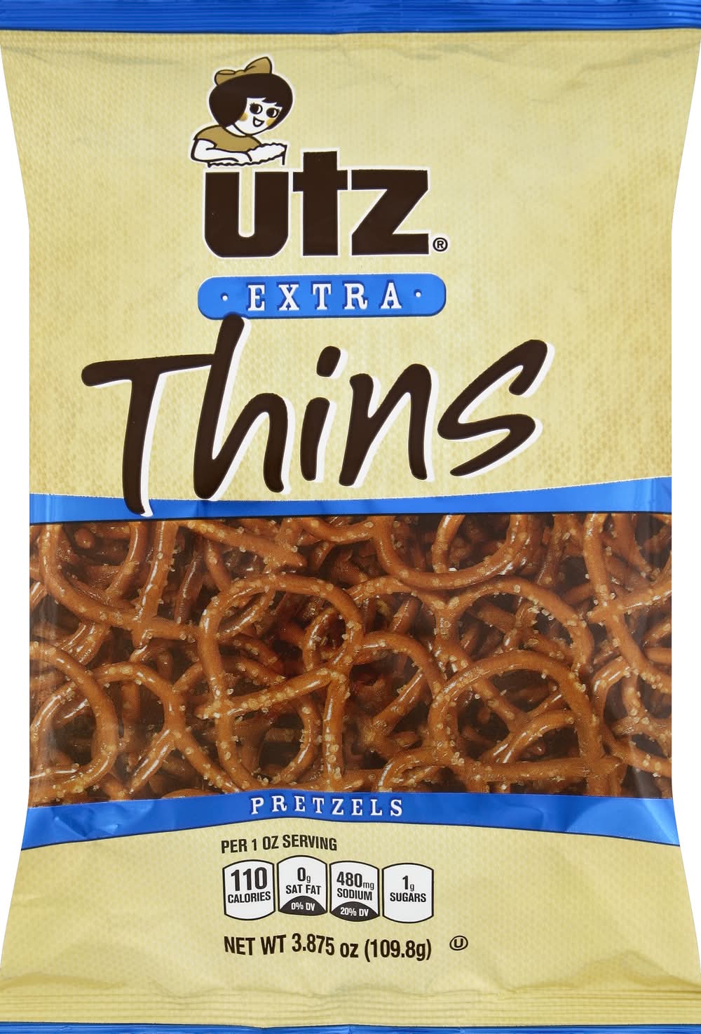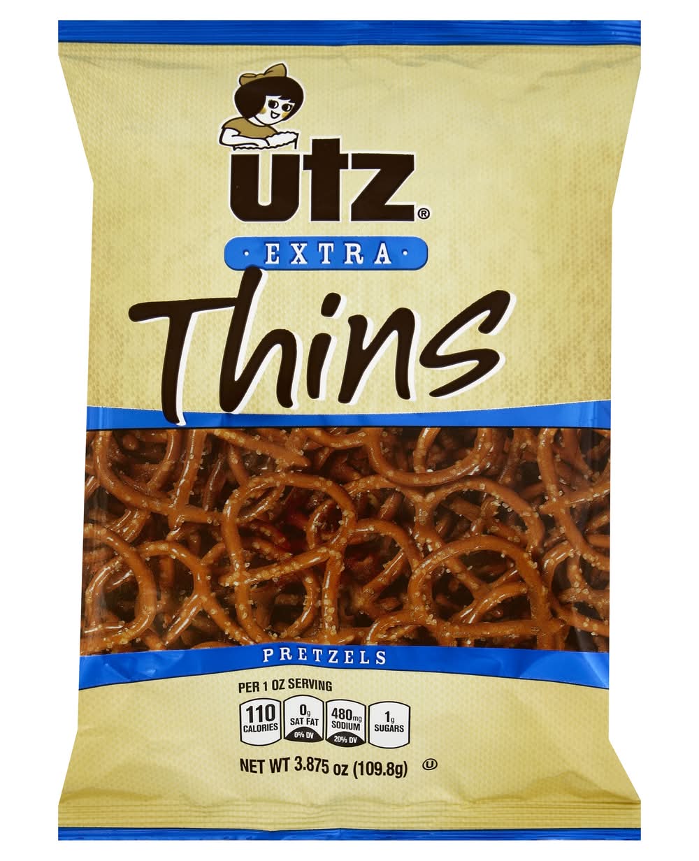 Per 1 oz Serving: 110 calories; 0 g sat fat (0% DV); 480 mg sodium (20% DV); 1 g sugars. Taste the goodness - with only one gram of fat per serving. Utz Extra Thin Pretzels are a triumph in the ancient art of pretzel-making. Our master bakers have perfected a process to lock in wholesome, delicious pretzel flavor while minimizing fat and calories. Utz pretzels - snacking smart never tasted so good! We unconditionally guarantee all Utz products. If you are ever dissatisfied, return the unused portion to the store where purchased for a full refund or satisfactory replacement, or write us at 900 High St, Hanover, PA 17331. Please include the name of the store where purchased, the price/code mark on the front of this package, and the reason for dissatisfaction. Snack Food Association: An international trade association. Made in a peanut and tree nut free facility. www.utzsnacks.com. Find us on Facebook. • Brand: Utz • kosher • Number of servings: 4
