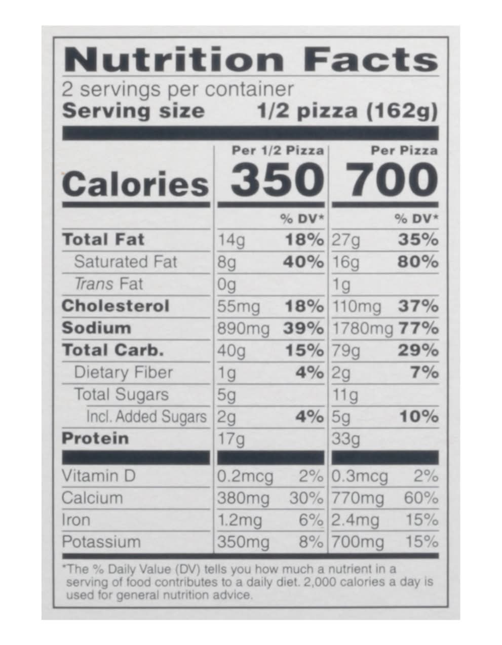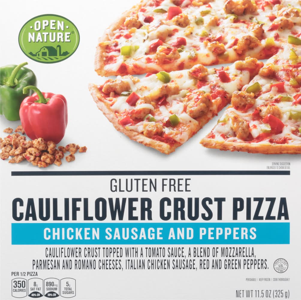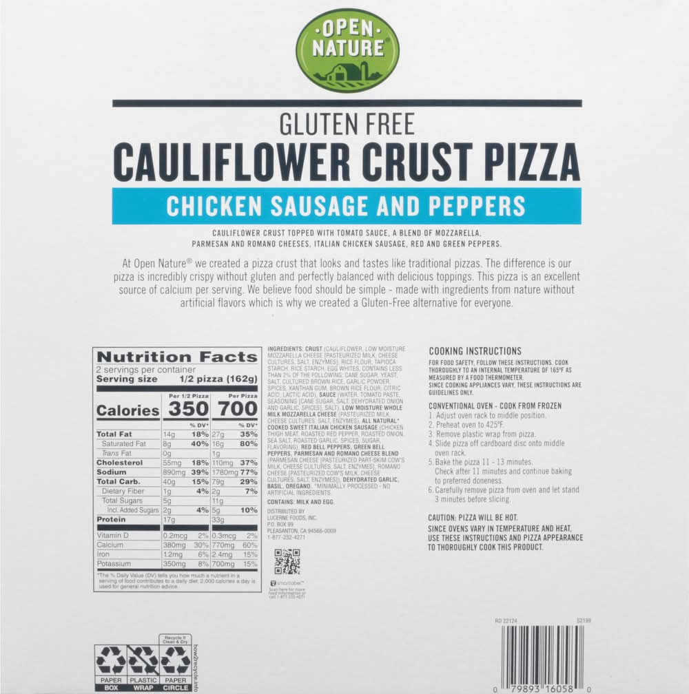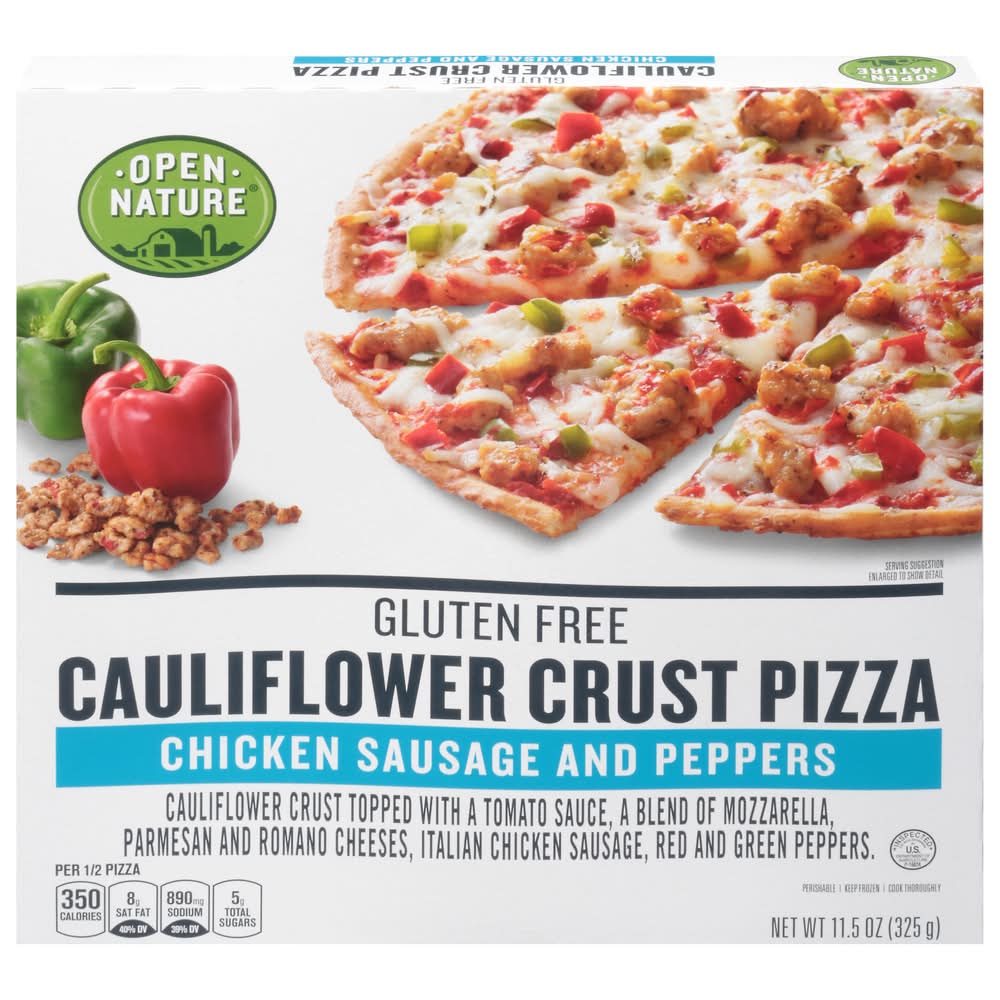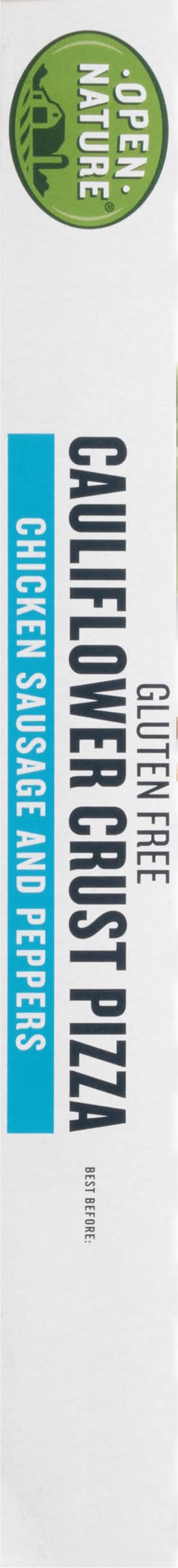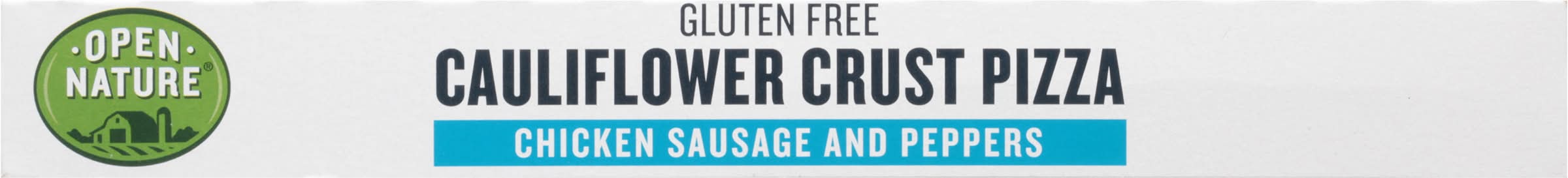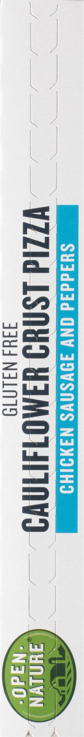 Cauliflower crust topped with tomato sauce, a blend of mozzarella, parmesan and Romano cheeses, Italian chicken sausage, red and green peppers. Per 1/2 Pizza: 350 calories; 8 g sat fat (40% DV); 890 mg sodium (39% DV); 5 g total sugars. Gluten free. At Open Nature we created a pizza crust that looks and tastes like traditional pizzas. The difference is our pizza is incredibly crispy without gluten and perfectly balanced with delicious toppings. This pizza is an excellent source of calcium per serving. We believe food should be simple - made with ingredients from nature without artificial flavors which is why we created a gluten-free alternative for everyone. Inspected for wholesomeness by U.S. Department of Agriculture. how2recycle.info. SmartLabel: Scan for more food information or call 1-877-232-4271. • Flavor: Chicken sausage & peppers • Packaging: Reusable
