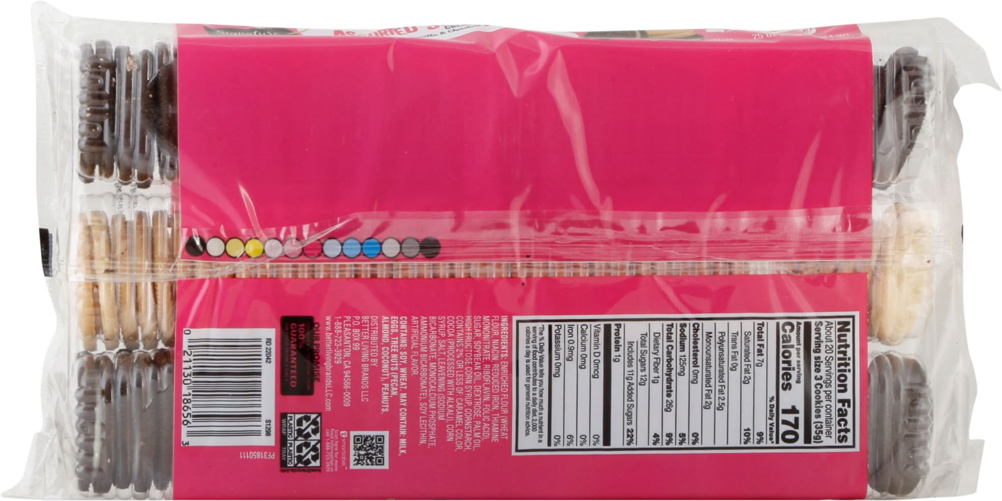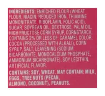 Ingredients: Enriched Flour (Wheat Flour, Niacin, Reduced Iron, Thiamine Mononitrate, Riboflavin, Folic Acid), Sugar, Soybean Oil, Dextrose, Palm Oil, High Fructose Corn Syrup, Cornstarch, Contains 2% or Less of: Caramel Color, Cocoa (Processed with Alkali), Corn Syrup, Salt, Leavening (Sodium Bicarbonate, Monocalcium Phosphate, Ammonium Bicarbonate), Soy Lecithin, Artificial Flavor. Contains: Soybeans, Wheat, Corn, Milk, Eggs, Peanuts
