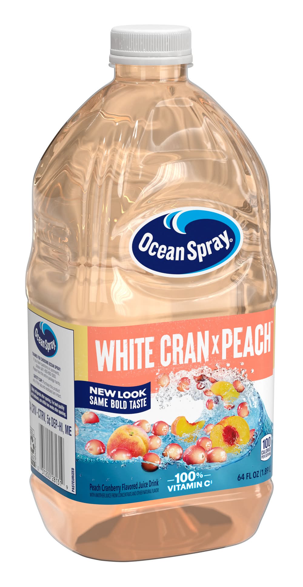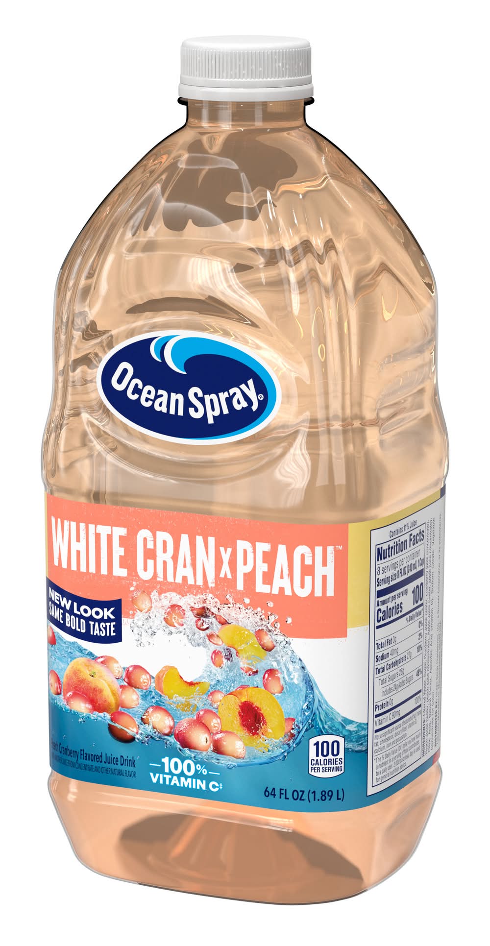Peach Cranberry Juice Drink with Another Juice from Concentrate. Every fruit's best friend. • Flavor: White cranberry-peach • Ocean Spray Cranberries, Inc., Lakeville-Middleboro, MA 02349 • Packaging: Reusable