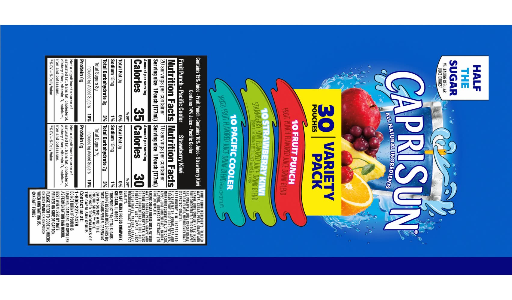 Fruit Punch Fruit Punch Flavored Juice Drink Blend Strawberry Kiwi Strawberry Kiwi Flavored Juice Drink Blend from Concentrate with Other Natural Flavor Pacific Cooler Mixed Fruit Flavored Juice Drink Blend from Concentrate We've always been dedicated to making pouches full of goodness but now we've leveled up. Each pouch is full of all natural ingredients and sweetened using monk fruit for the taste kids love with half the sugar†. A small change that's big for everyone. †Vs: leading regular juice drinks Fill in game Grab a little juicy freedom. This is the time for you and that means spending Meet monk fruit A sun-ripened fruit similar to a melon that we use to create the perfect amount of delicious sweetness. It's a different, all natural ingredient, but one thing stays the same... They'll love the taste. So grab a pouch, jab in the straw, and sip away. • Flavor: Fruit punch-strawberry kiwi-pacific cooler • Pack size: 30 • Kraft heinz foods company, Chicago,IL,60601, • Packaging: Reusable