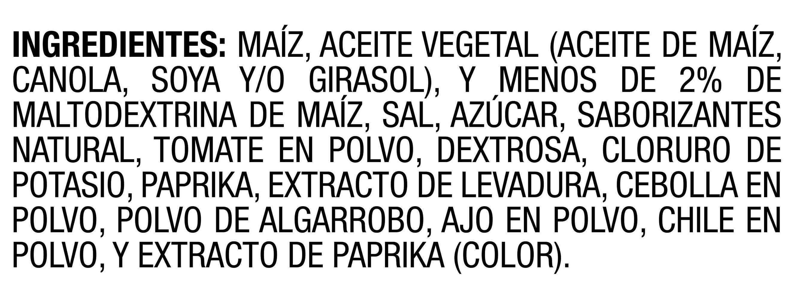 Ingredients: Corn, Vegetable Oil (Corn, Canola, And/Or Sunflower Oil), Maltodextrin (Made From Corn), Monosodium Glutamate, Salt, Sugar, Dextrose, Tomato Powder, Paprika, Spices, Onion Powder, Garlic Powder, Yeast Extract, Natural And Artificial Flavors, And Artificial Color (Yellow 5 Lake, Yellow 6 Lake, Red 40 Lake, Blue 1 Lake) Contains: CONTAINS MILK INGREDIENTS