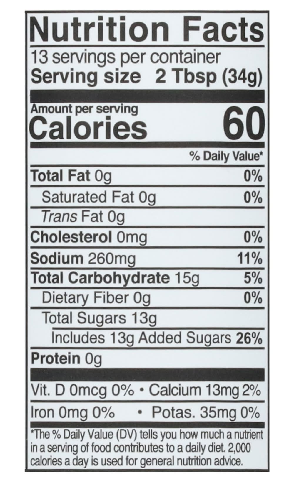 Ingredients: Tomato Puree (Water, Tomato Paste), Brown Sugar, Molasses, Vinegar, Sugar, Corn Starch, Salt, Worcester- Shire Sauce (Vinegar, Molasses, Corn Syrup, Water, Salt, Caramel Color, Garlic Powder, Sugar, Spices, Tamarind, Natural Flavor), Natural Smoke Flavor (Includes Natural Hickory Smoke Flavor), Garlic Powder, Onion Powder, Caramel Color, Ground Red Pepper, Xanthan Gum Contains: Corn