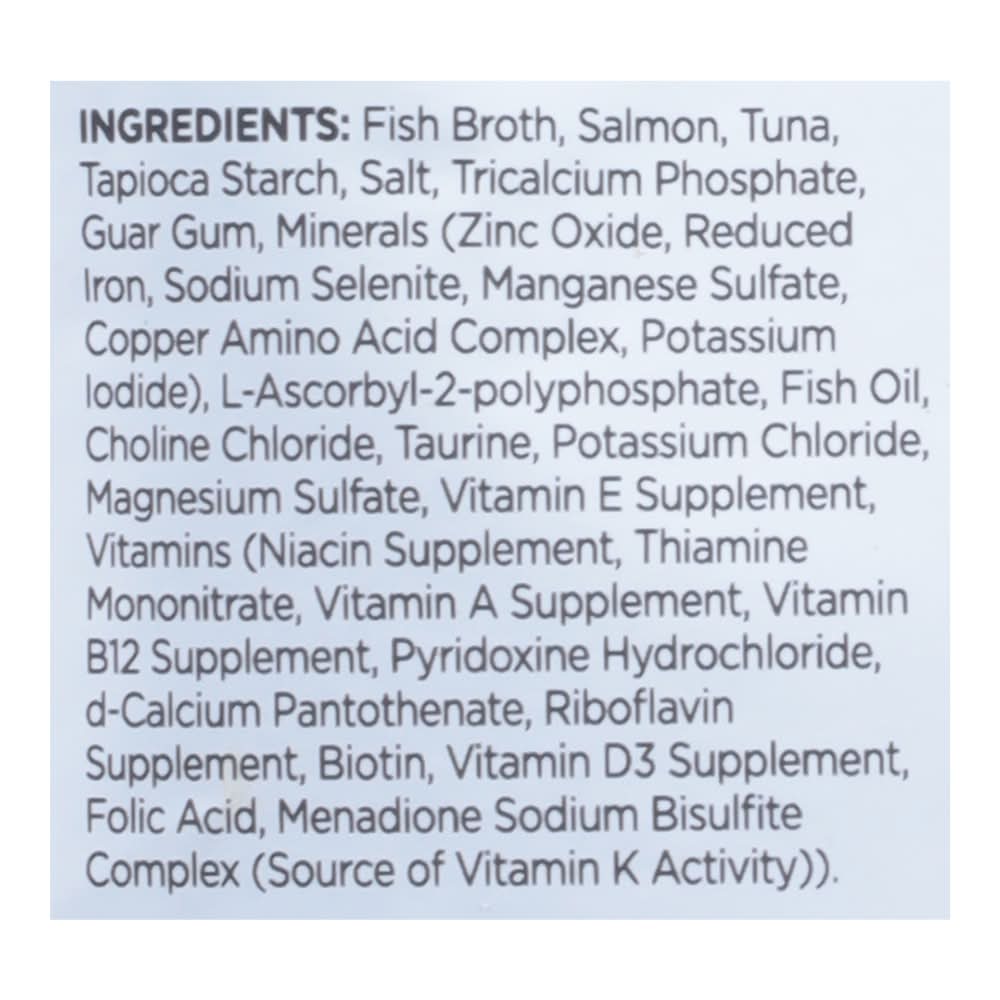 Ingredients: Fish Broth, Salmon, Tuna, Tapioca Starch, Salt, Tricalcium Phosphate, Guar Gum, Minerals (Zinc Oxide, Reduced Iron, Sodium Selenite, Manganese Sulfate, Copper Amino Acid Complex, Potassium Lodide), L-Ascorbyl-2-Polyphosphate, Fish Oil, Choline Chloride, Taurine, Potassium Chloride, Magnesium Sulfate, Vitamin E Supplement, Vitamins (Niacin Supplement, Thiamine Mononitrate, Vitamin A Supplement, Vitamin B12 Supplement, Pyridoxine Hydrochloride, D-Calcium Pantothenate, Riboflavin Supplement, Biotin, Vitamin D3 Supplement, Folic Acid, Menadione Sodium Bisulfite Complex (Source of Vitamin K Activity)) Contains: Fish, Fish, Salmon, Fish, Tuna, Sulfites