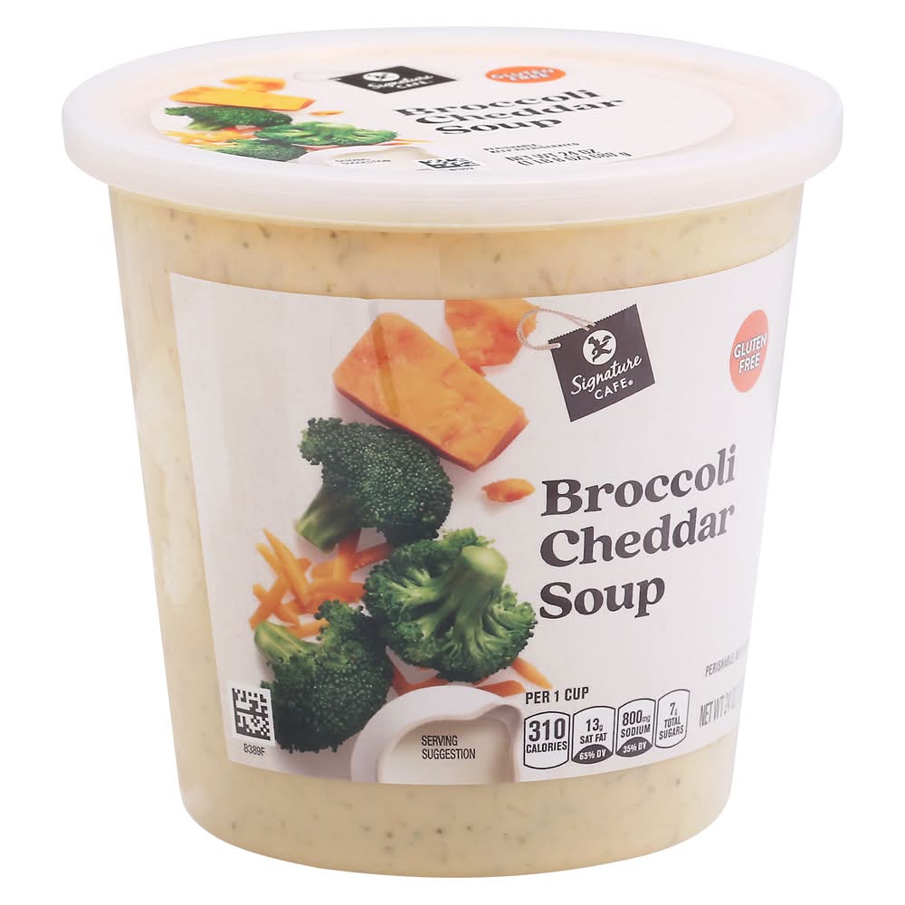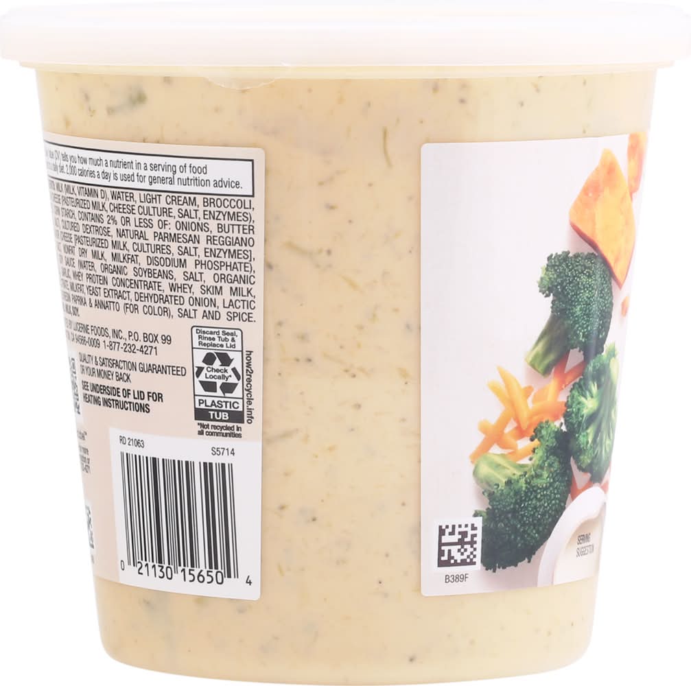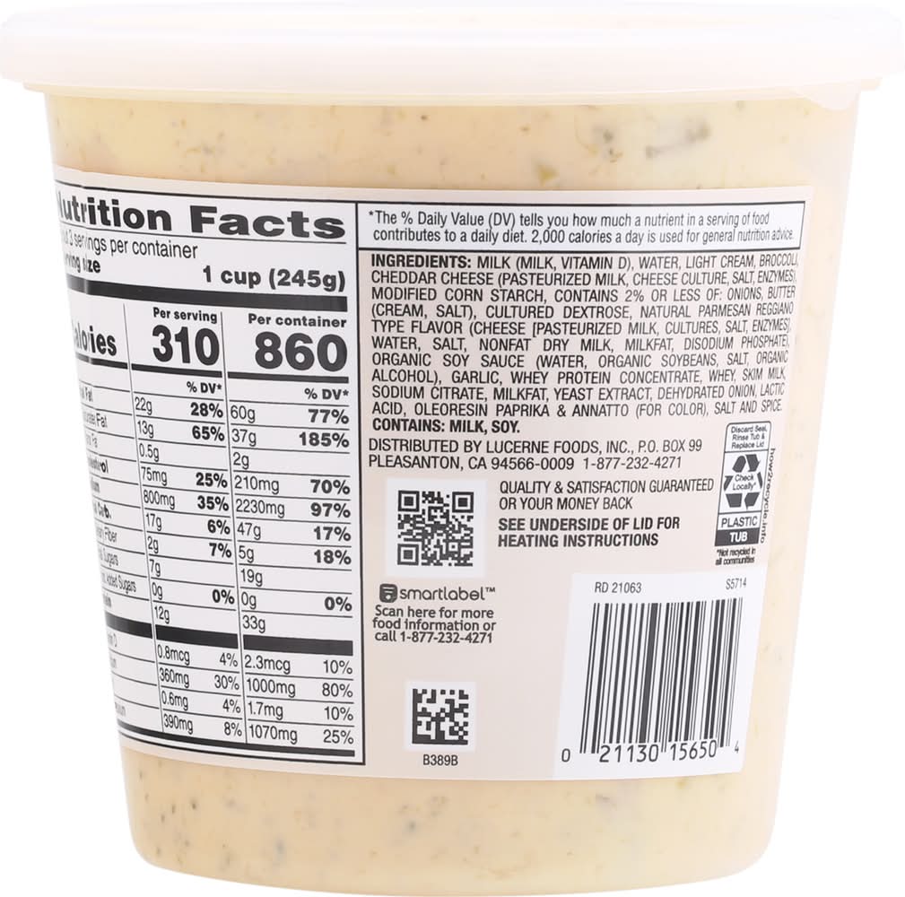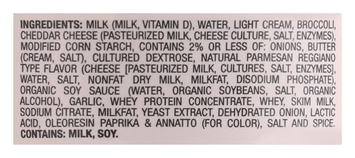 Ingredients: Milk (Milk, Vitamin D), Water, Light Cream, Broccoli, Cheddar Cheese (Pasteurized Milk, Cheese Culture, Salt, Enzymes), Modified Corn Starch, Contains 2% or Less of: Onions, Butter (Cream, Salt), Cultured Dextrose, Natural Parmesan Reggiano Type Flavor (Cheese [Pasteurized Milk, Cultures, Salt, Enzymes), Water, Salt, Nonfat Dry Milk, Milkfat, Disodium Phosphate), Organic Soy Sauce (Water, Organic Soybeans, Salt, Organic Alcohol), Garlic, Whey Protein Concentrate, Whey, Skim Milk, Sodium Citrate, Milkfat, Yeast Extract, Dehydrated Onion, Lactic Acid, Oleoresin Paprika & Annatto (for Color), Salt and Spice. Contains: Milk, Soybeans