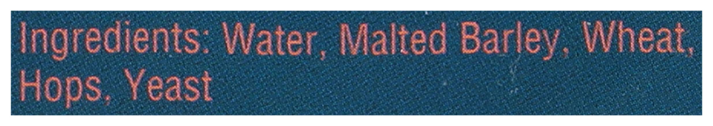 Ingredients: Water, Malted Barley, Wheat, Hops, Yeast Contains: Barley, Wheat