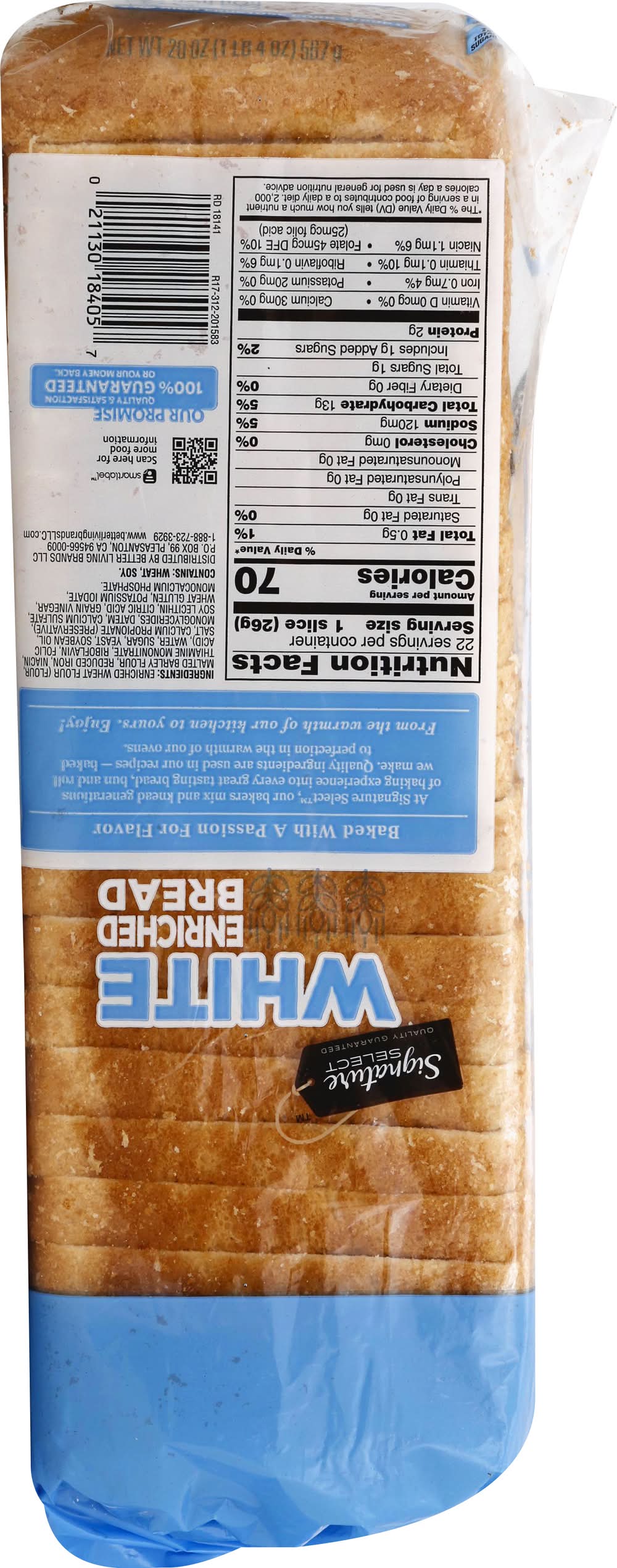 No high fructose corn syrup. Baked with A Passion For Flavor: At Signature Select, our bakers mix and knead generations of baking experience into every great tasting bread, bun and roll we make. Quality ingredients are used in our recipes - baked to perfection in the warmth of our ovens. From the warmth of our kitchen to yours. Enjoy! Quality guaranteed. • Better Living Brands LLC, P.O. Box 99,Pleasanton,CA,94566-0009 • Packaging: Reusable