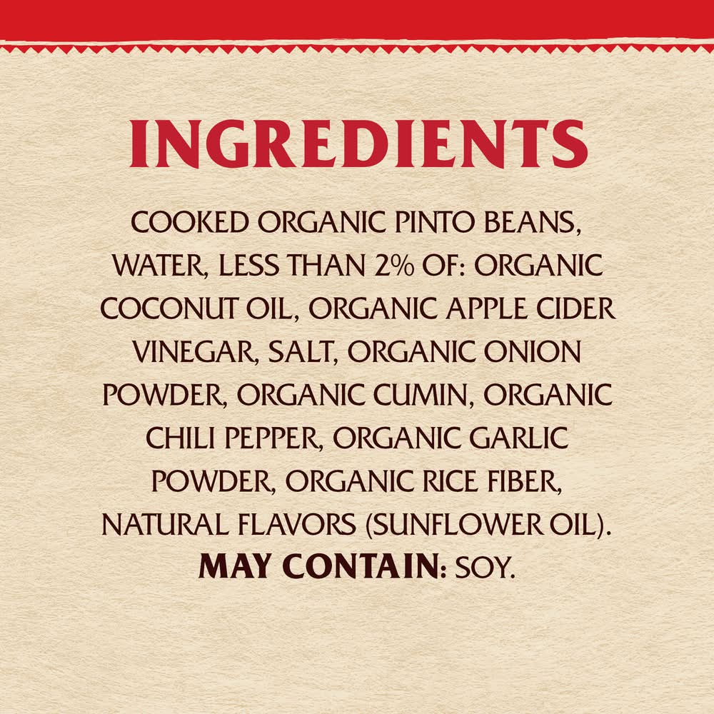 Ingredients: Cooked Organic Pinto Beans, Water, Less than 2% of: Organic Coconut Oil, Organic Cider Vinegar, Salt, Organic Onion Powder, Organic Cumin, Organic Chili Pepper, Organic Garlic Powder, Organic Rice Fiber, Natural Flavors (Sunflower Oil), . MAY CONTAIN: SOY. Contains: Soy