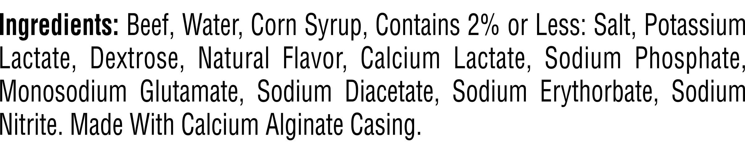 Ingredients: Beef, water, corn syrup, Contains 2% or less: salt, potassium lactate, dextrose, natural flavor, calcium lactate, sodium phosphate, monosodium glutamate, sodium diacetate, sodium erythorbate, sodium nitrite. Made With Calcium Alginate Casing. Contains: Corn