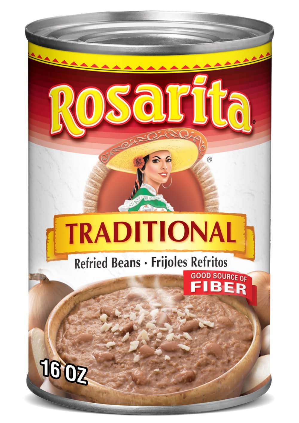 For over 70 years Rosarita has continued to make delicious Mexican sauces, beans, and refried beans. When it comes to your family's Mexican food night, serve them the taste of true Mexican heritage with Rosarita. With Rosarita Traditional Refried Beans, you can give your family a delicious Mexican-style meal. Add Rosarita original-recipe, Mexican-style refried beans for authentic and delicious Mexican-style dishes and sides. On the stovetop, heat the beans over medium heat in a saucepan until hot, stirring occasionally or microwave in a covered microwave-safe dish on high for one and one-half minutes or until hot. Rosarita Traditional Refried Beans have 100 calories per serving with zero grams trans fat. • Conagra Brands, PO Box 3534, Chicago, IL, 60654 • Packaging: Reusable