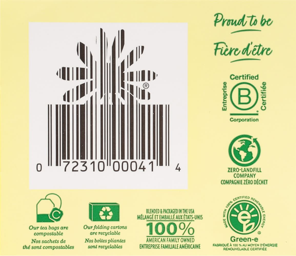 Pure chamomile flowers for quiet moments. Gluten free. Caffeine free. Non GMO. Family tea blenders since 1945. 20 tea bags individually wrapped in foil pouches. Protected in Foil to maintain the integrity of our carefully selected ingredients, we wrap each tea bag in a foil pouch to ensure the fullest flavor, freshness, and aroma. bigelowtea.com. Certified B Corporation. Zero Landfill Company. Our folding cartons are recyclable. Made with 100% certified renewable energy Green-e. Our tea bags are compostable. Blended and packaged in the U.S.A. • Flavor: Chamomile • Rc Bigelow, Inc., Fairfield, CT, 06825-5512, USA • Packaging: Reusable