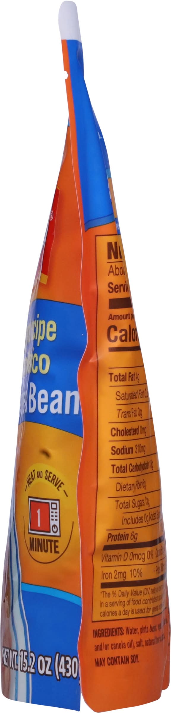 Stovetop: 1. tear open. 2. squeeze. mix in 2 tbsp of cooking oil if desired. 3. heat over medium heat. stir beans occasionally until heated. microwave: 1. tear open. 2. heat on high for 1 min (microwave times may vary with different appliances). caution: pouch will be hot, be careful when opening and handling the pouch. 3. squeeze. if you wish, add your personal touch with some cheese topping. refrigerate unused portion and use within 7 days.