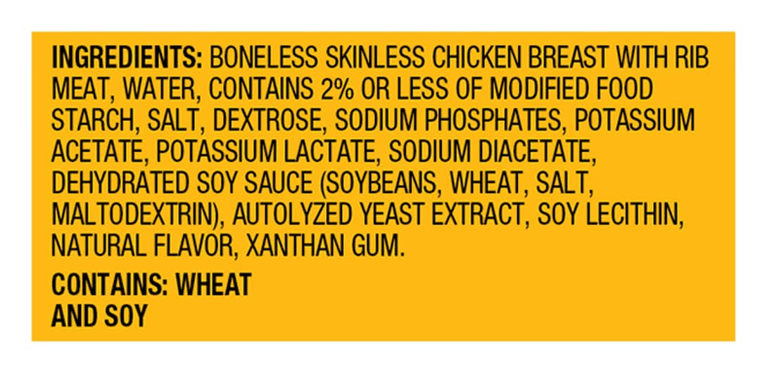 Ingredients: Boneless Skinless Chicken Breast with Rib Meat, Water, Contains 2% or Less of Modified Food Starch, Salt, Dextrose, Sodium Phosphates, Potassium Acetate, Potassium Lactate, Sodium Diacetate, Dehydrated Soy Sauce (Soybeans Wheat Salt Maltodextrin), Autolyzed Yeast Extract, Soy Lecithin, Natural Flavor, Xanthan Gum Contains: Wheat, Soybeans