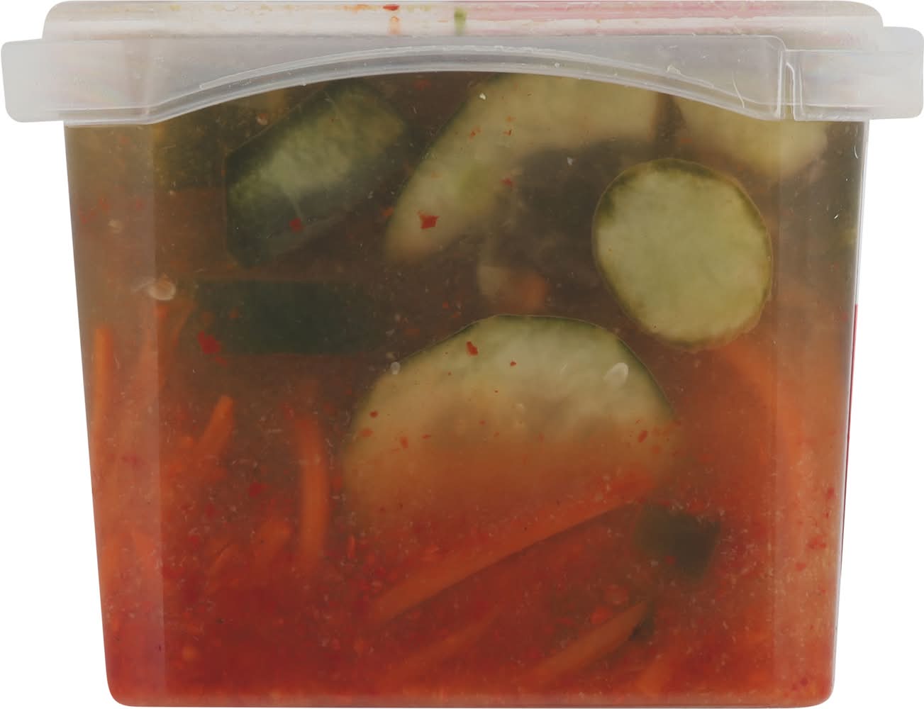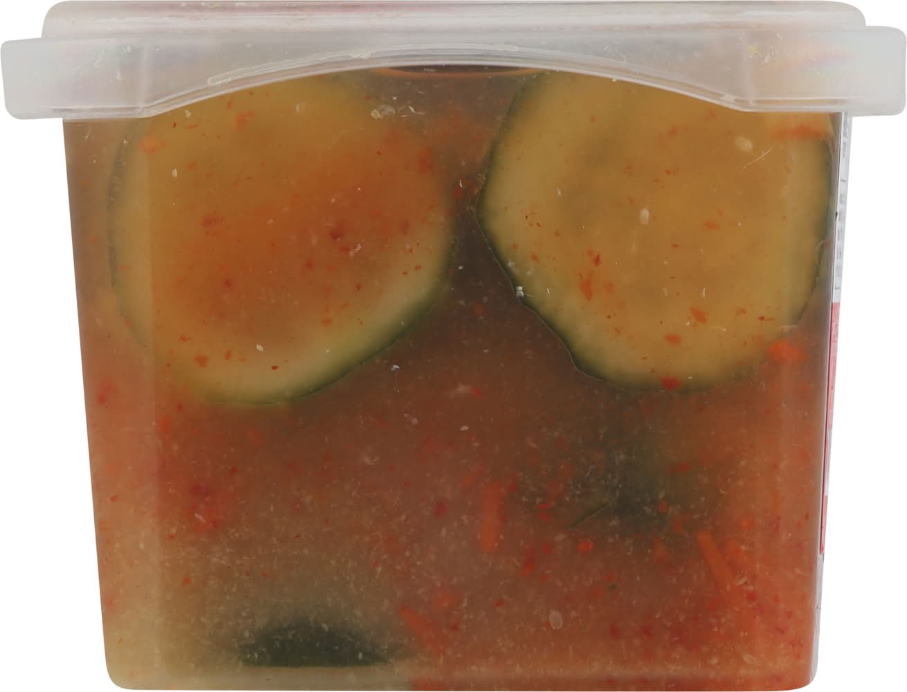 Ingredients: Cucumbers, Water, Vinegar, Apple, Garlic, Sugar, Salt, Carrots, Green Onions, Gochugaru Red Pepper, Ginger, Calcium Chloride (Natural Mineral Salt)