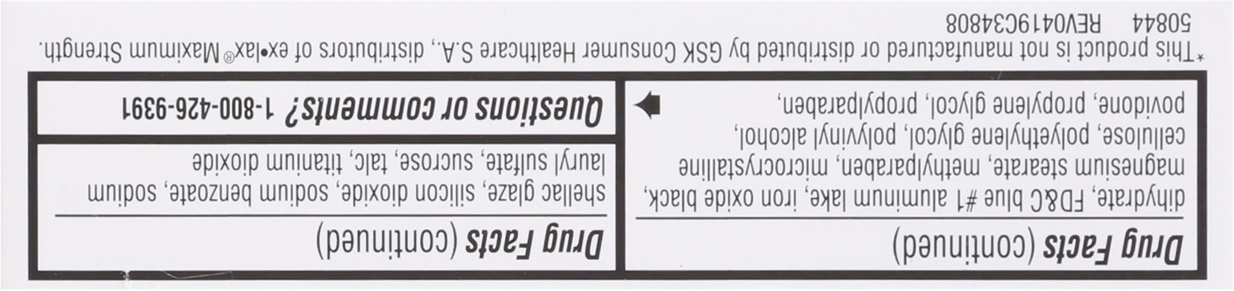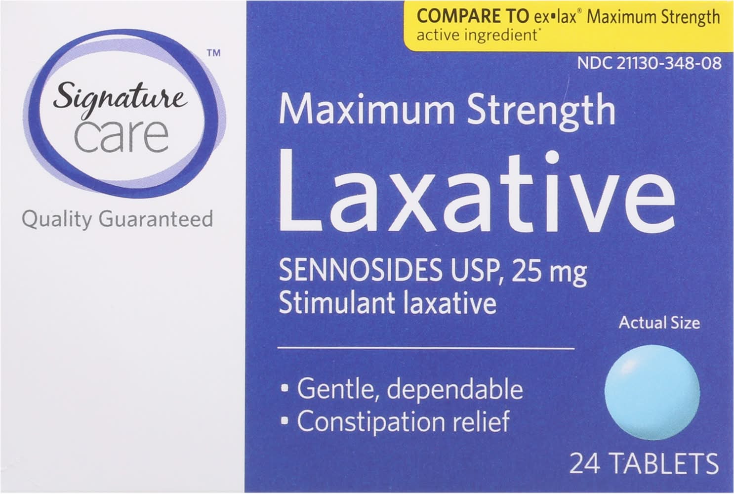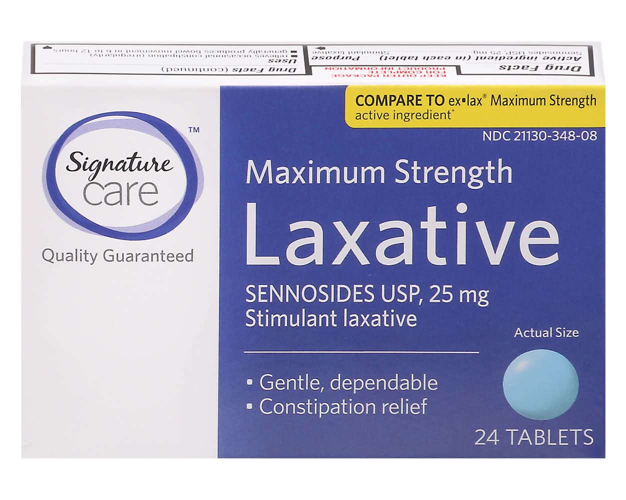 Compare to Ex.Lax Maximum Strength active ingredient (This product is not manufactured or distributed by GSK Consumer Healthcare S.A., distributors of Ex.Lax Maximum Strength). Sennoside USP, 25 mg. Stimulant laxative. Gentle, dependable. Constipation relief. Quality Guaranteed. Our promise: Quality satisfaction 100% guaranteed or your money back. www.betterlivingbrandsLLC.com.