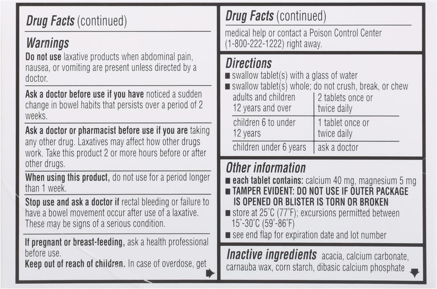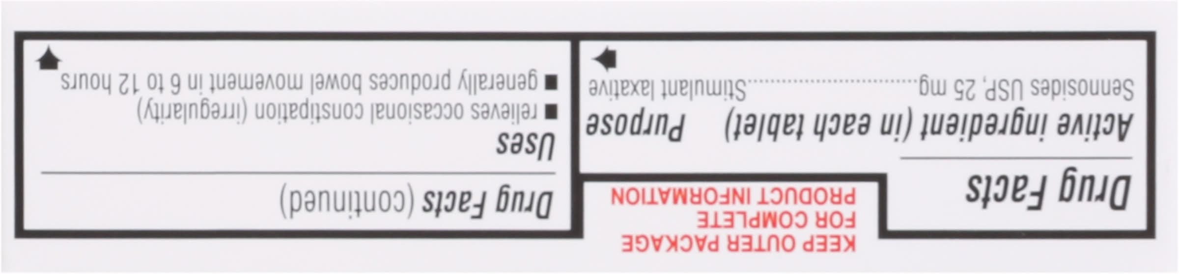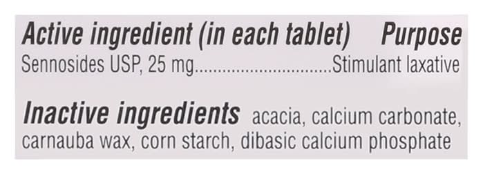 Ingredients: In Each Tablet Active Ingredients: Sennosides USP (25 mg), Stimulant Laxative. Inactive Ingredients: Acacia, Calcium Carbonate, Carnauba Wax, Corn Starch, Dibasic Calcium Phosphate, Shellac Glaze, Silicon Dioxide, Sodium Benzoate, Sodium Lauryl Sulfate, Sucrose, Talc, Titanium Dioxide. Additives: Inactive Ingredients: Acacia, Calcium Carbonate, Carnauba Wax, Corn Starch, Dibasic Calcium Phosphate, Shellac Glaze, Silicon Dioxide, Sodium Benzoate, Sodium Lauryl Sulfate, Sucrose, Talc, Titanium Dioxide.