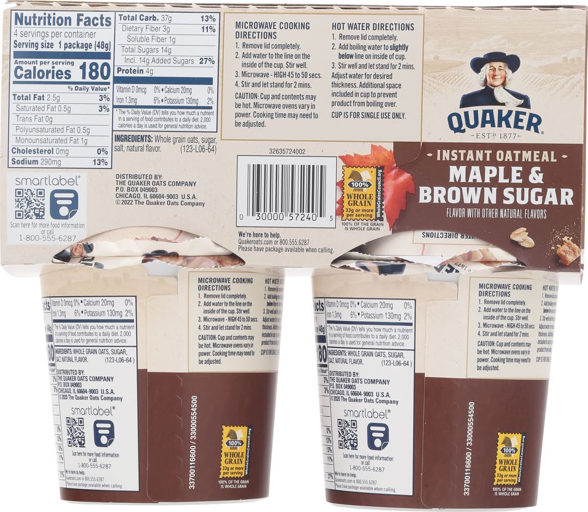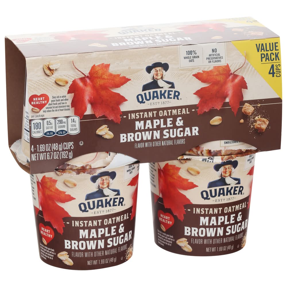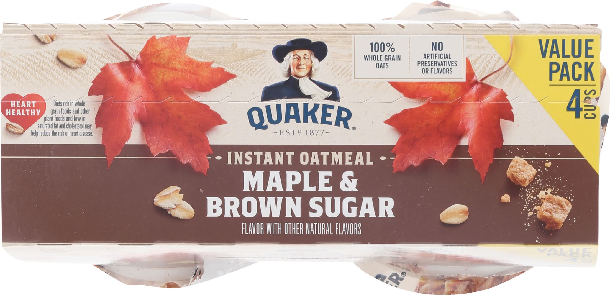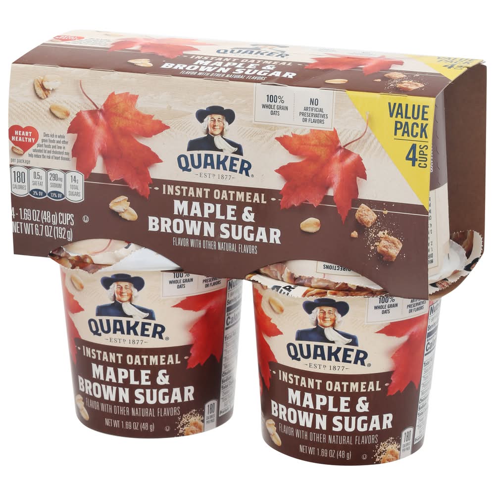 Flavor with other natural flavors. No artificial preservatives or flavors. 100% whole grain oats. Heart healthy: diets rich in whole grain foods and other plant foods and low in saturated fat and cholesterol may help reduce the risk of heart disease. • Flavor: Maple & brown sugar • Pack size: 4 • The Quaker Oats Company, P.O .Box 049003,Chicago,IL