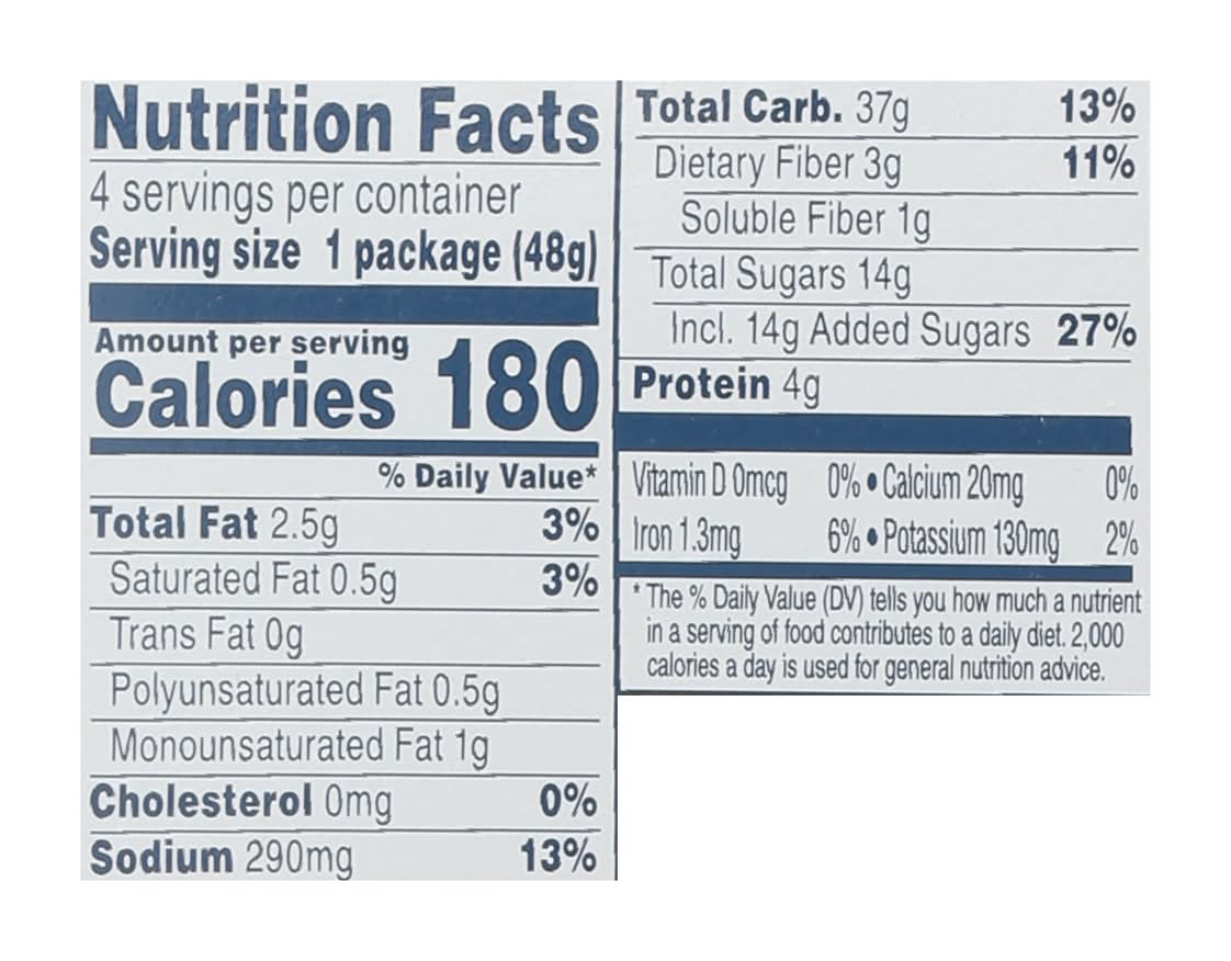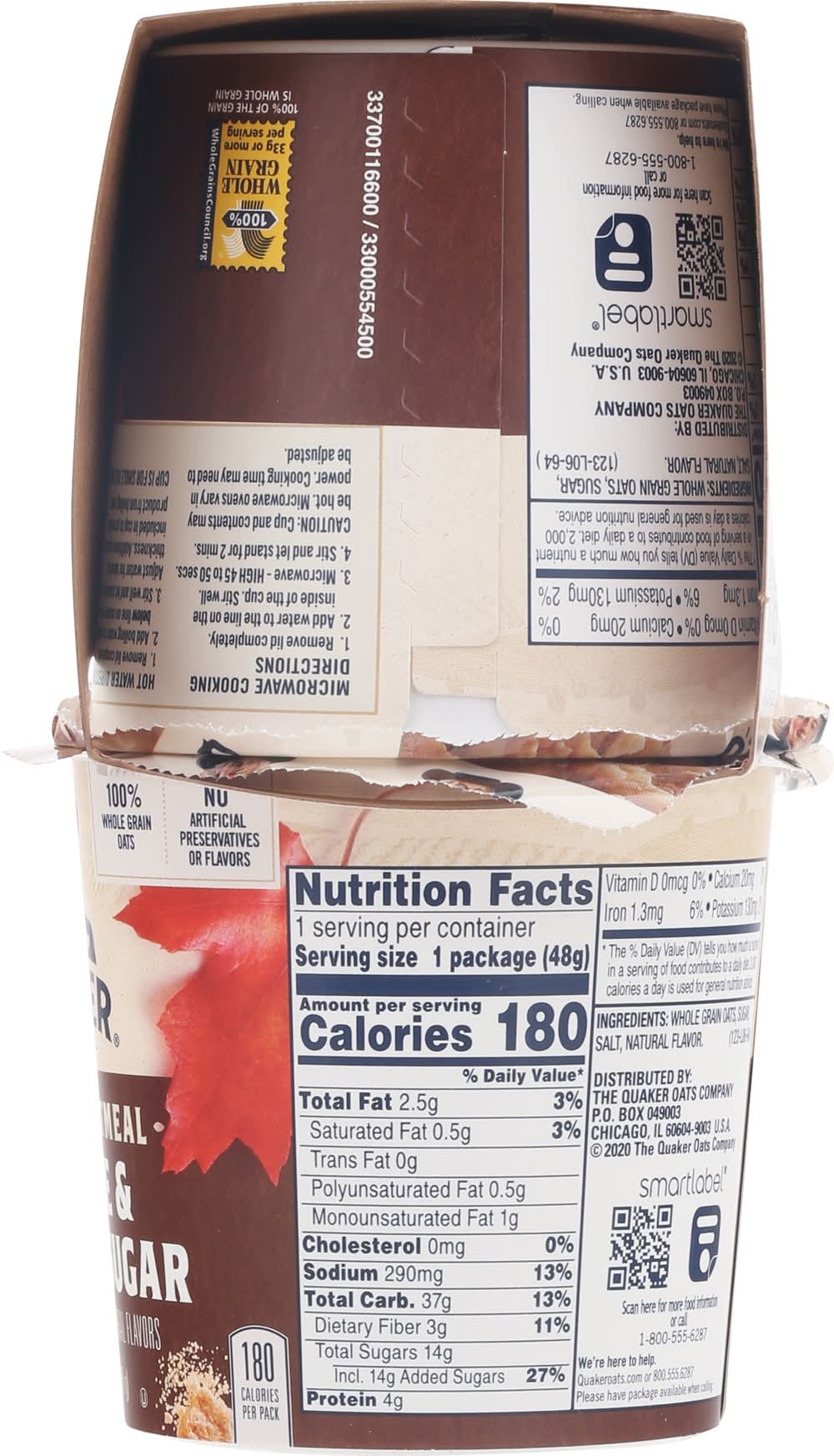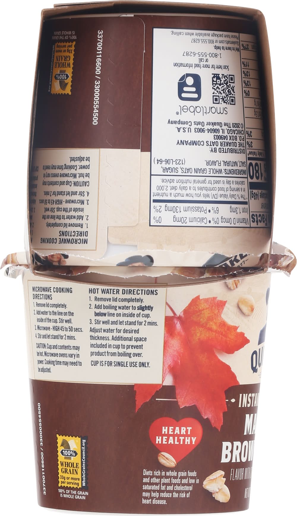 Flavor with other natural flavors. No artificial preservatives or flavors. 100% whole grain oats. Heart healthy: diets rich in whole grain foods and other plant foods and low in saturated fat and cholesterol may help reduce the risk of heart disease. • Flavor: Maple & brown sugar • Pack size: 4 • The Quaker Oats Company, P.O .Box 049003,Chicago,IL