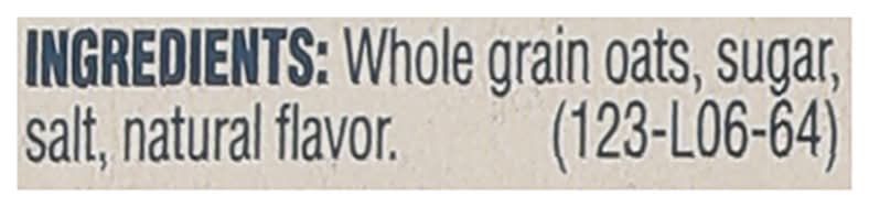 Ingredients: Whole Grains Oats, Sugar, Salt, Natural Flavor Contains: Oat