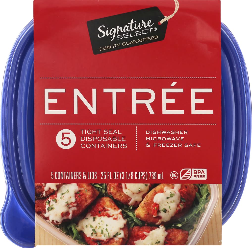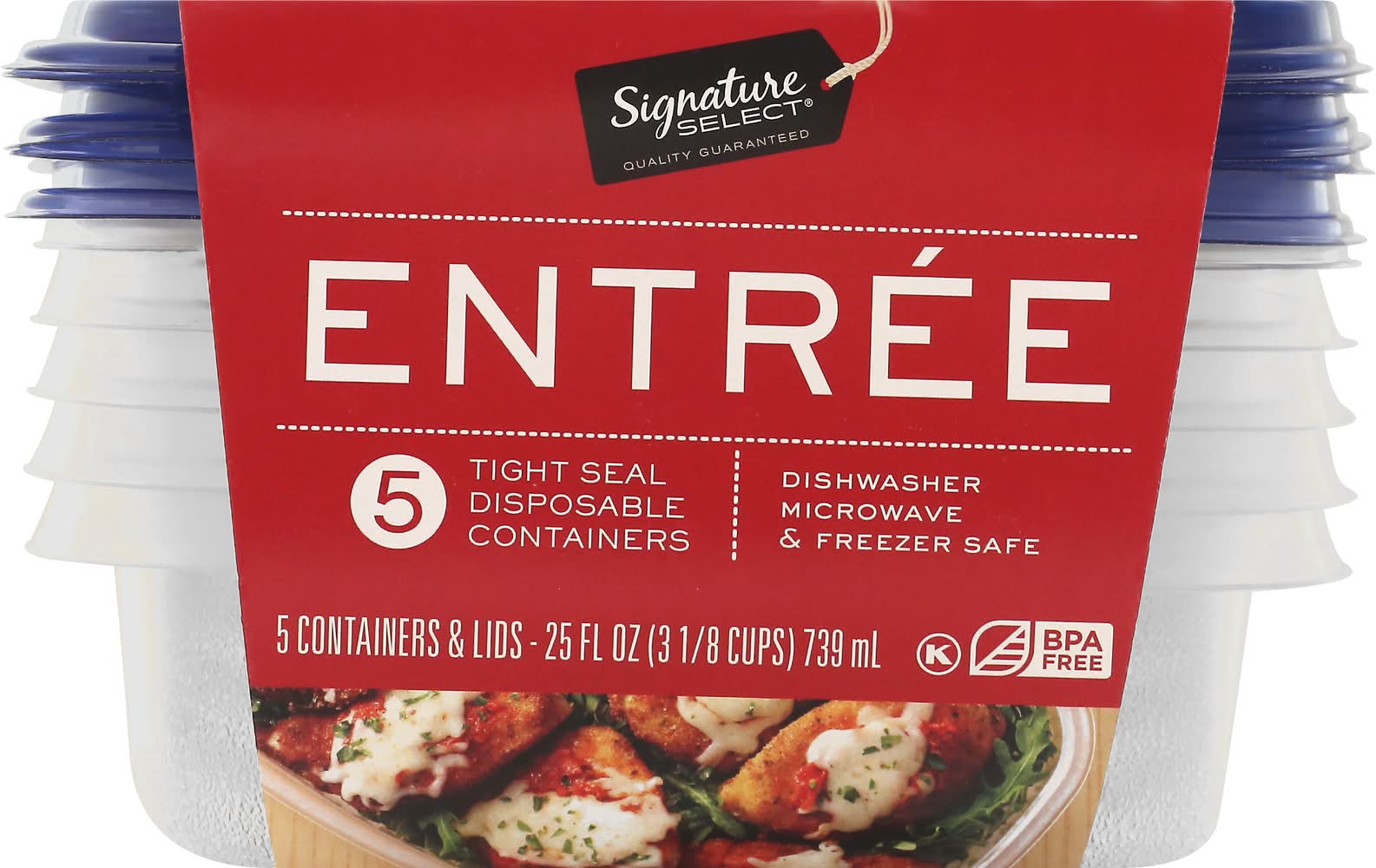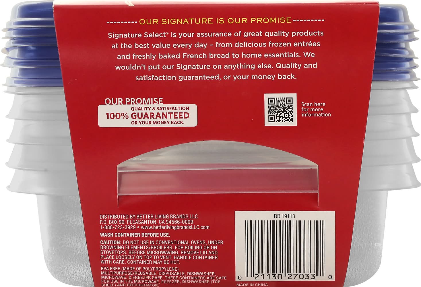 5 tight seal disposable containers. 25 fl oz (3 1/8 cups) 739 ml. Dishwasher safe. Microwave & freezer safe. Multipurpose/reusable, disposable, dishwasher, microwave & freezer safe. These containers are safe for use in the microwave, freezer. Dishwasher (Top shelf) and refrigerator. Quality guaranteed. Our Promise: 100% guaranteed quality & satisfaction or your money back. Our Signature is our Promise: Signature Select is your assurance of great quality products at the best value every day - from delicious frozen entrees and freshly baked French bread to home essentials. We wouldn't put our signature on anything else. Quality and satisfaction guarantee, or your money back. www.betterlivingbrandsLLC.com. Scan for more information. These containers are safe for use in the microwave, freezer, dishwasher (top shelf) and refrigerator. BPA free (Made of polypropylene). Made in China. www.betterlivingbrandsLLC.com, Po Box 99, Pleasanton, CA, 94566-0009.