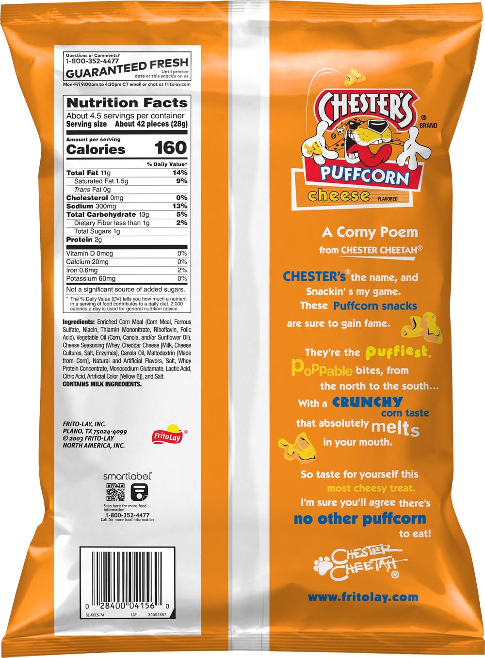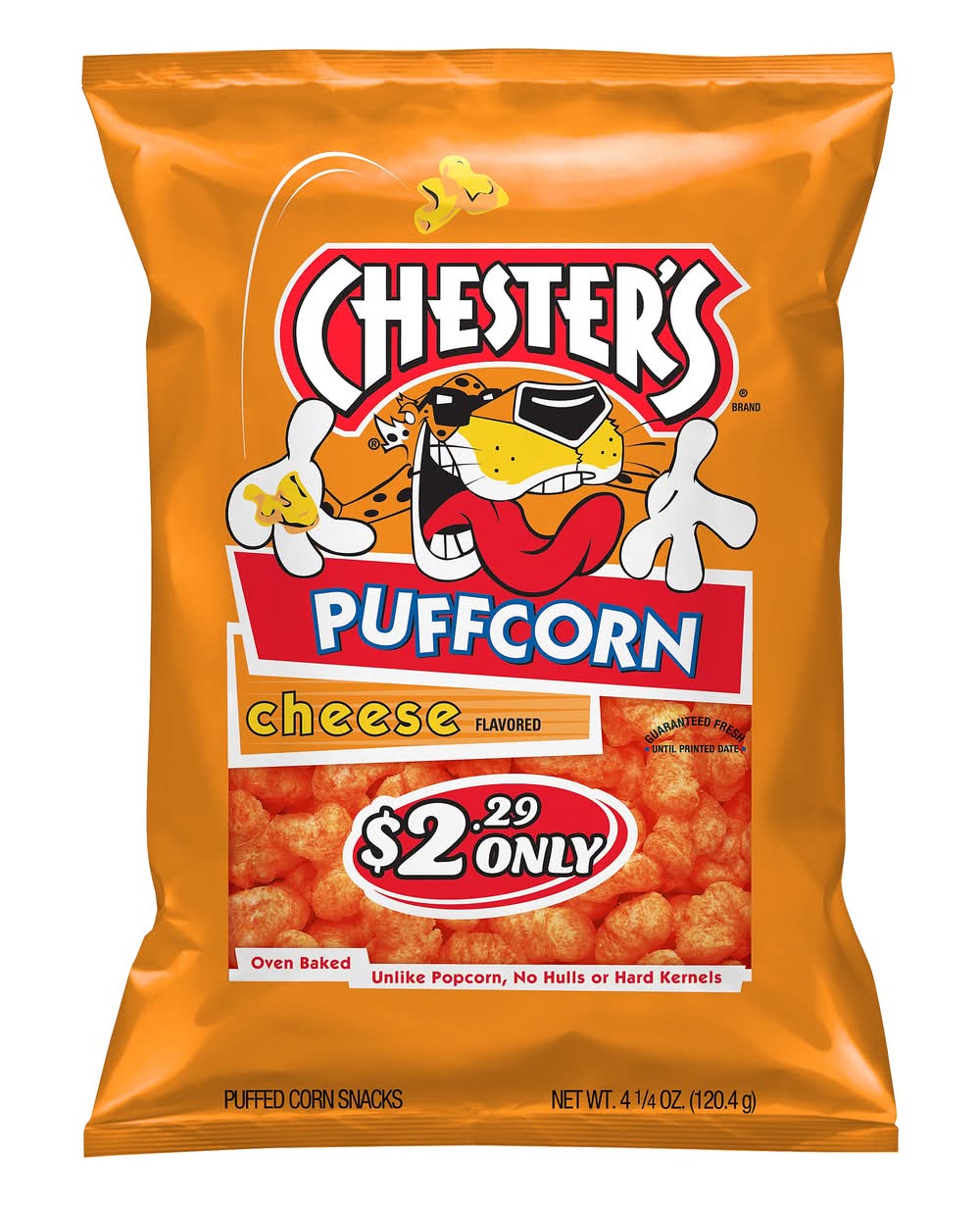 Oven baked. Unlike popcorn, no hulls or hard kernels. These puff corn snacks are sure to gain fame. They're the puffiest, poppable bites, from the north to the south. With a crunchy corn taste that absolutely melts in your mouth. So taste for yourself this most cheesy treat. • Flavor: Cheese • Frito-Lay, Inc., Plano, TX, 75024