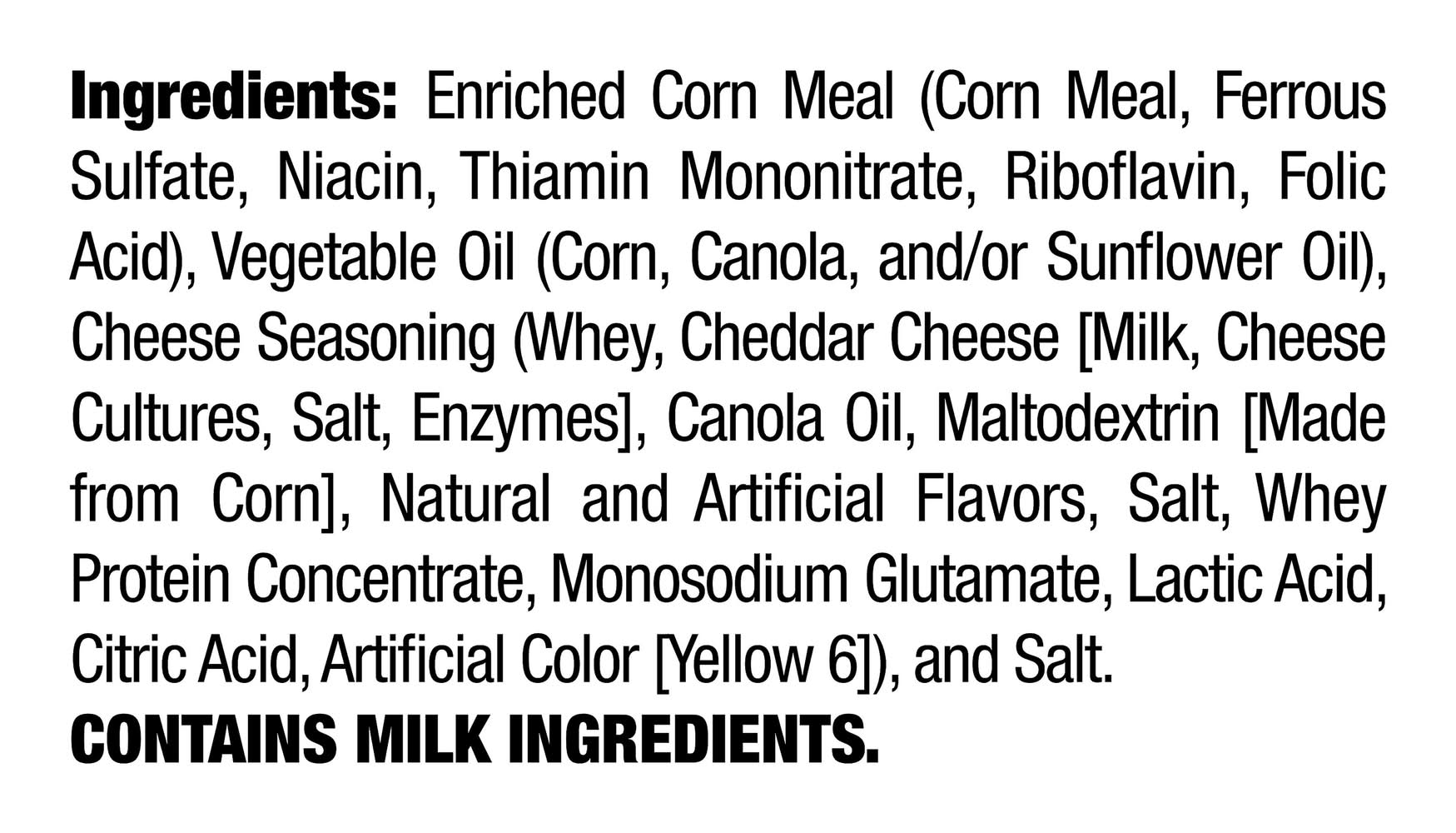 Ingredients: Enriched Corn Meal (Corn Meal, Ferrous Sulfate, Niacin, Thiamin Mononitrate, Riboflavin, Folic Acid), Vegetable Oil (Corn, Canola, and or Sunflower Oil), Cheese Seasoning (Whey, Cheddar Cheese [Milk, Cheese Cultures, Salt, Enzymes], Canola Oil, Maltodextrin [Made from Corn], Natural and Artificial Flavors, Salt, Whey Protein Concentrate, Monosodium Glutamate, Lactic Acid, Citric Acid, Artificial Color [Yellow 6]), and Salt Contains: Milk