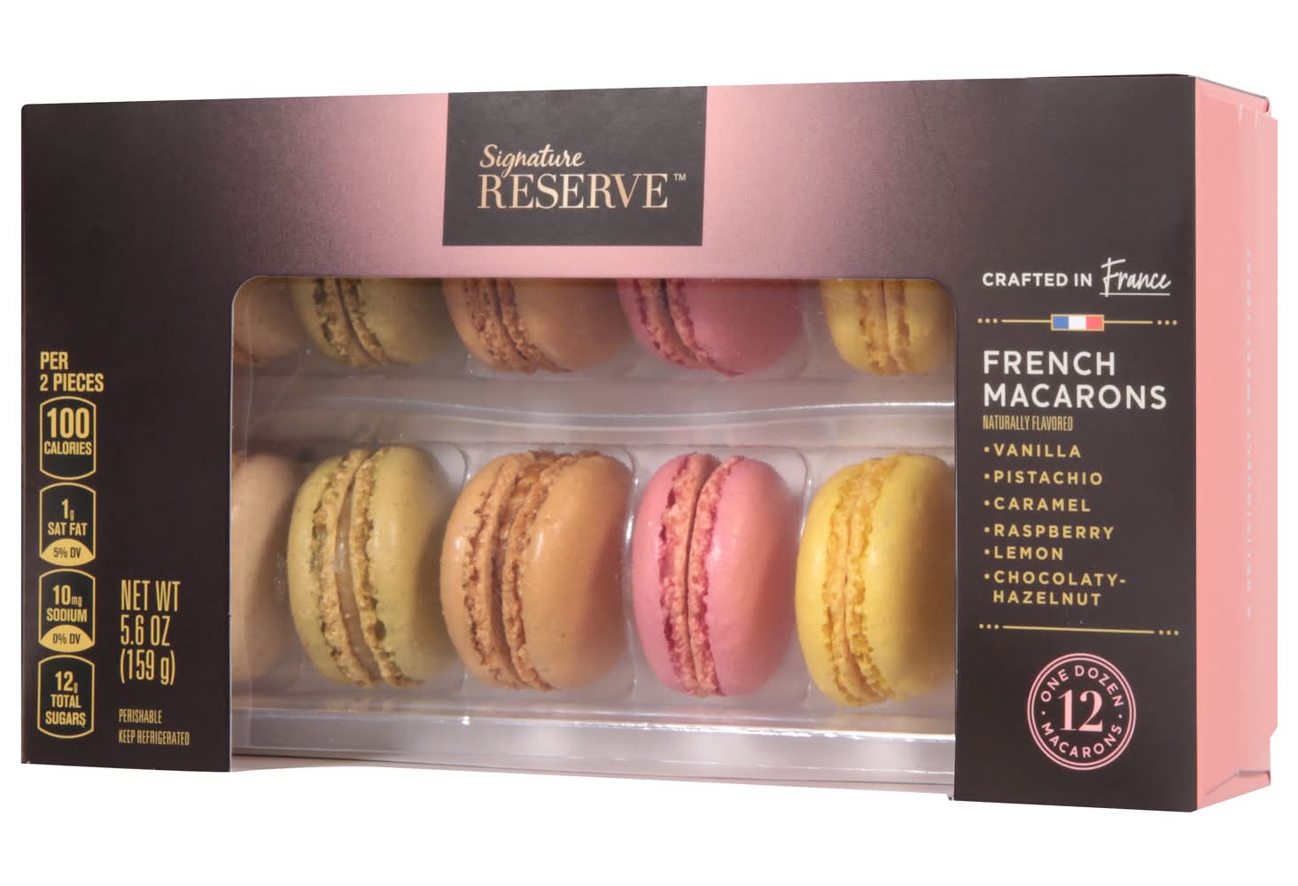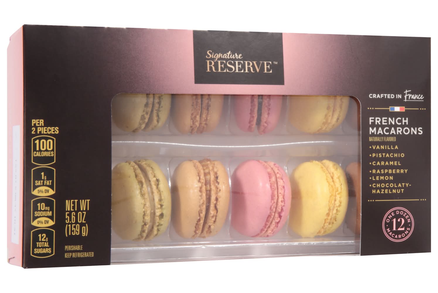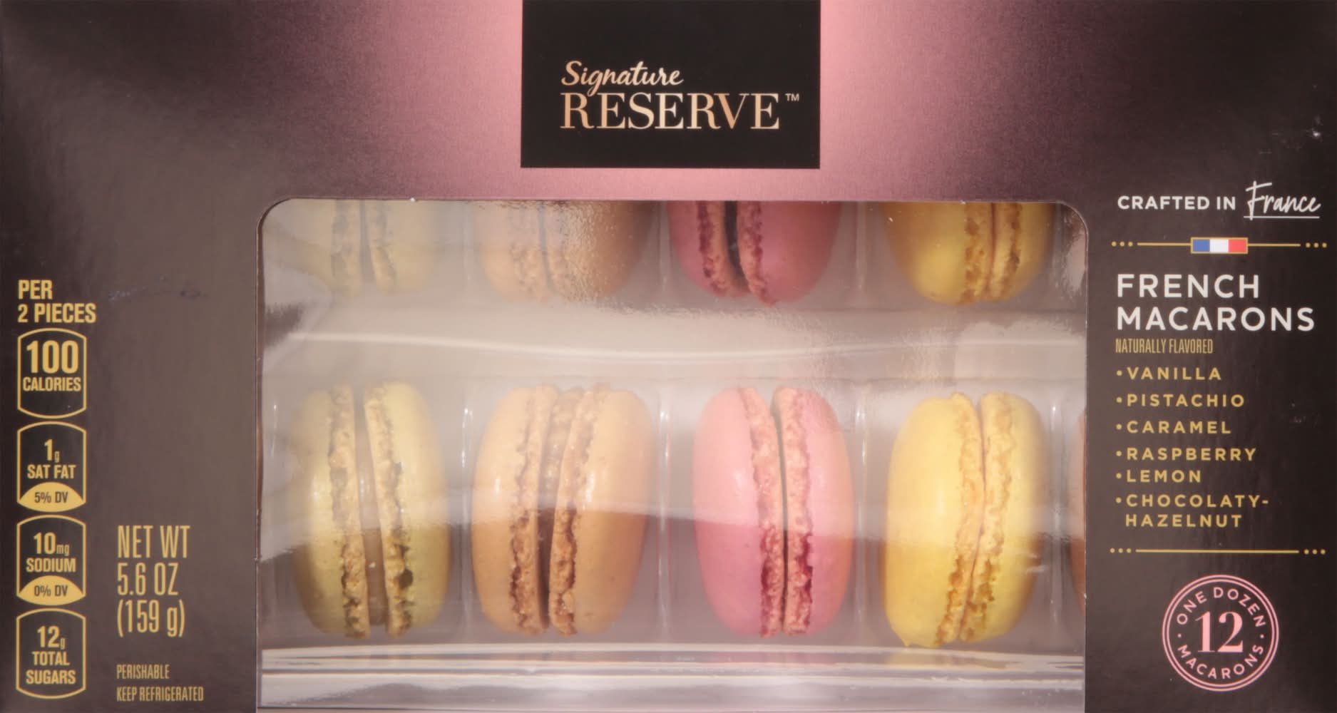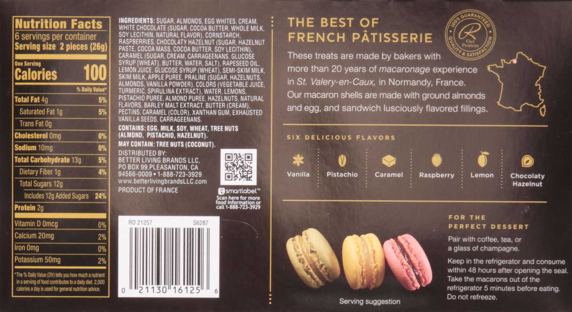 Vanilla; pistachio; caramel; raspberry; lemon; chocolaty-hazelnut. Naturally flavored. Per 2 Pieces: 100 calories; 1 g sat fat (5% DV); 10 mg sodium (0% DV); 12 g total sugars. One dozen. The best of French Patisserie: These treats are made by bakers with more than 20 years of macaronage experience in St. Valery-en-Caux, in Normandy, France. Our macaron shells are made with ground almonds and egg, and sandwich lusciously flavored fillings. Six Delicious Flavors: vanilla; pistachio; caramel; raspberry; lemon; chocolaty hazelnut. A deliciously sweet treat. Our Promise: 100% guaranteed quality & satisfaction. www.betterlivingbrandsLLC.com. how2recycle.info. Smartlabel: Scan for more food information or call 1-888-723-3929. Crafted in France. Product of France.