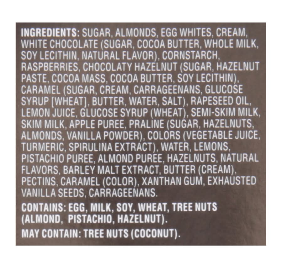 Ingredients: Sugar, Almonds, Egg Whites, Cream, White Chocolate (Sugar, Cocoa Butter, Whole Milk, Soy Lecithin, Natural Flavor), Cornstarch, Raspberries, Chocolaty Hazelnut (Sugar, Hazelnut Paste, Cocoa Mass, Cocoa Butter, Soy Lecithin), Caramel (Sugar, Cream, Carrageenans, Glucose Syrup [Wheat], Butter, Water, Salt), Rapeseed Oil, Lemon Juice, Glucose Syrup (Wheat), Semi-Skim Milk, Skim Milk, Apple Puree, Praline (Sugar, Hazelnuts, Almonds, Vanilla Powder), Colors (Vegetable Juice, Turmeric, Spirulina Extract), Water, Lemons, Pistachio Puree, Almond Puree, Hazelnuts, Natural Flavors, Barley Malt Extract, Butter (Cream), Pectins, Caramel (Color), Xanthan Gum, Exhausted Vanilla Seeds, Carrageenans. Contains: Eggs, Milk, Soybeans, Wheat, Corn, Barley