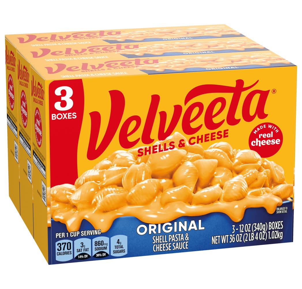 Shell yeah! Live life to the creamiest with Velveeta Shells & Cheese Pasta. When your drip is as smooth as ours, you don’t waste time when it comes to delicious indulgence. For instant cheesy gratification, our original recipe hits the mark, with iconic, velvety meltability and tender pasta shells that grip the drip like no other. Made with real cheese, Velveeta’s supremely creamy texture and rich, savory taste satisfy your cravings any day of the week. Amp things up by customizing our cheesy pasta with added veggies, meat, toppings or seasonings. Sometimes unnecessary is necessary, so kick back, relax and embrace the flavor, whether it’s in the form of a snack, side dish or entree. Luxuriously convenient, preparing Velveeta Shells and Cheese is a breeze. Simply boil the shell pasta on your stovetop according to the instructions, drain, combine with the included packet of melty cheese sauce and enjoy, unapologetically. Makes approximately 3 servings per box; about 9 servings total per pack. That’s La Dolce Velveeta! • Pack size: 3 • Kraft Heinz Foods Company, Chicago, IL 60601 • Packaging: Reusable
