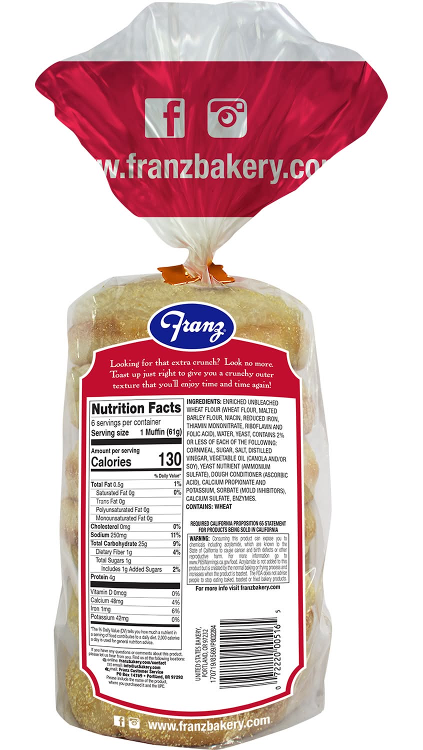 Franz Extra Crisp English Muffins (13 oz, 6 ct)