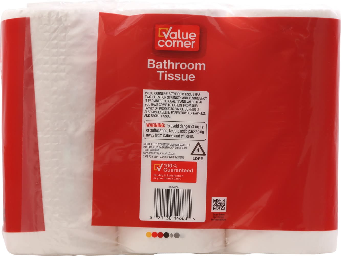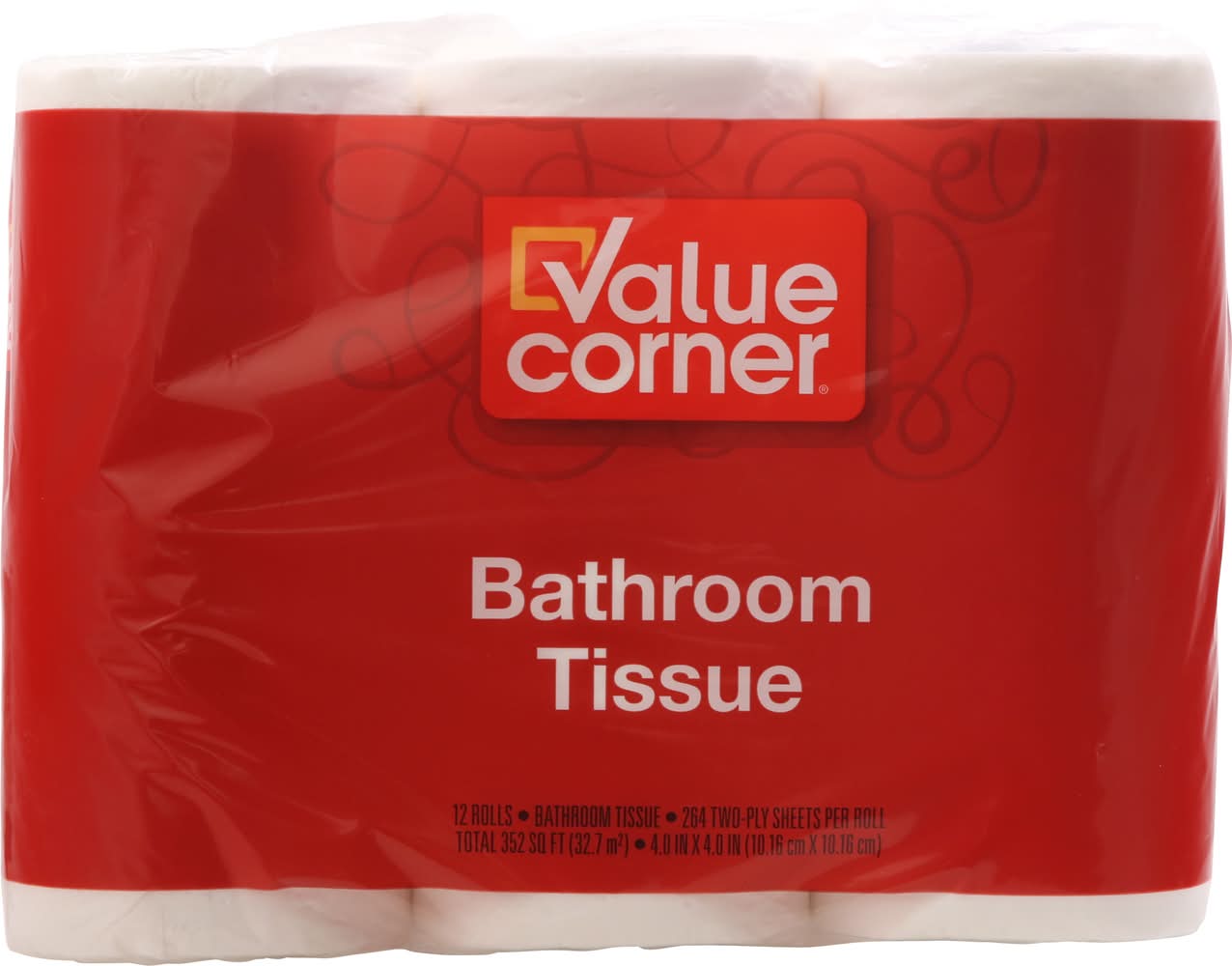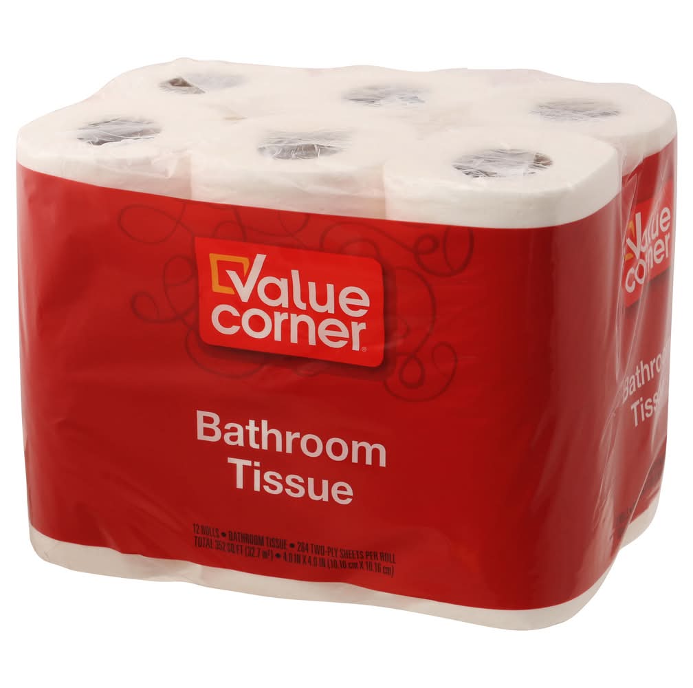 264 two-ply sheets per roll 352 sq ft (32.7 m2) 4.0 in x 4.0 in (10.16 cm x 10.16 cm). Value Corner bathroom tissue has two-plies for strength and absorbency. It provides the quality and value that you have come to expect from our family of products. Value Corner is also in paper towels, napkins, and facial tissue. Safe for septic and sewer systems. 100% guarantee quality & satisfaction or your money back. • Size: 4x4 in • Better Living Brands LLC, PO Box 99,Pleasanton,CA,94566-0009 • Packaging: Reusable