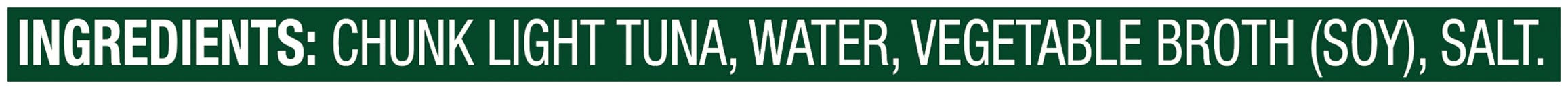 Ingredients: Chunks Light Tuna, Water, Vegetable Broth (Soy), Salt Contains: Fish, Tuna, Soybeans