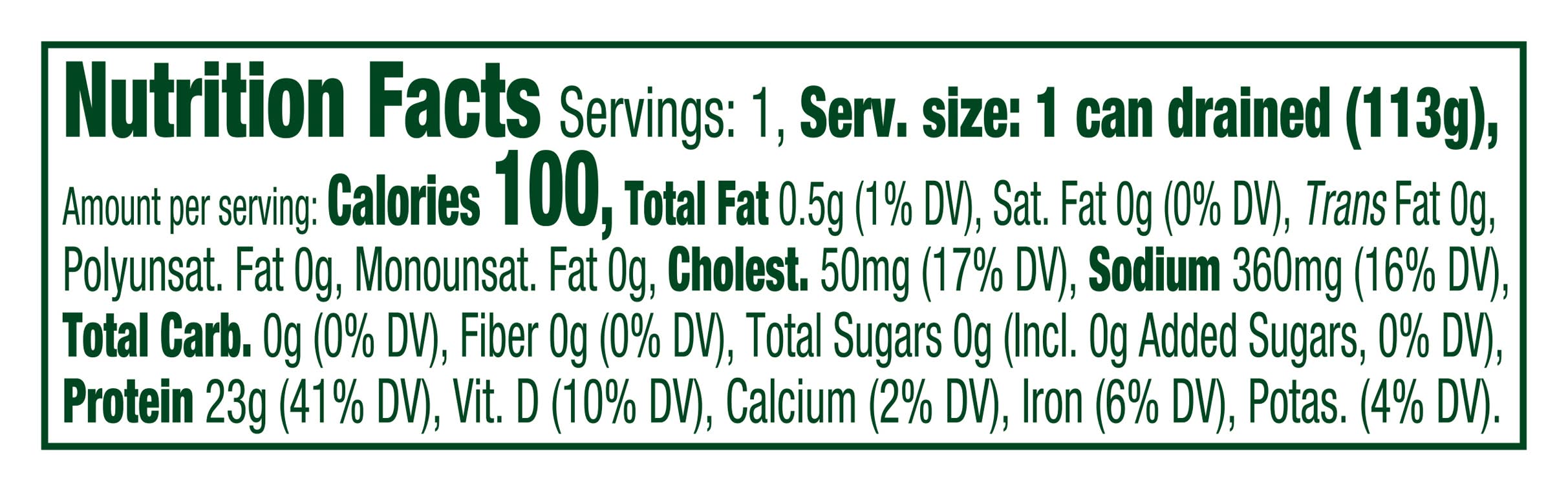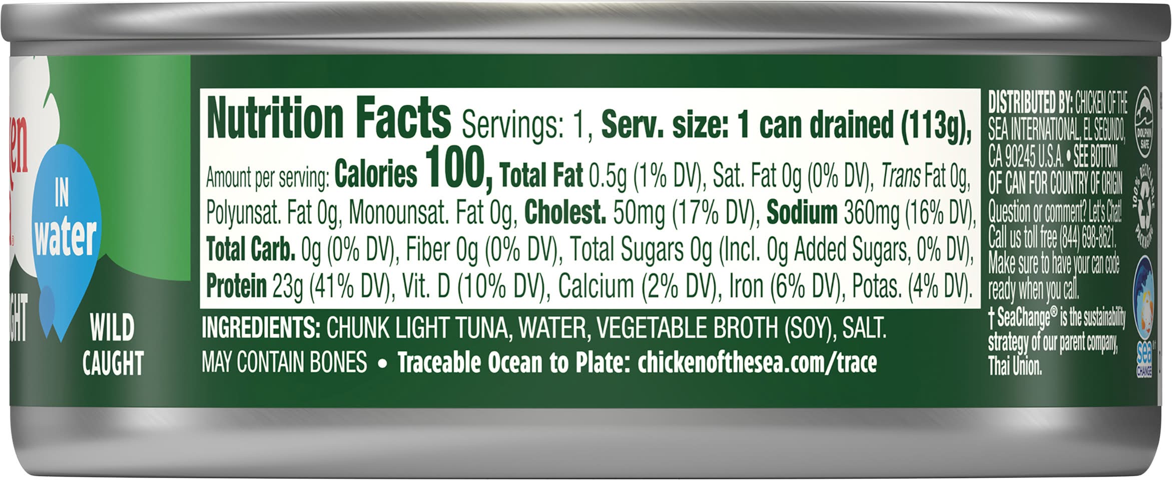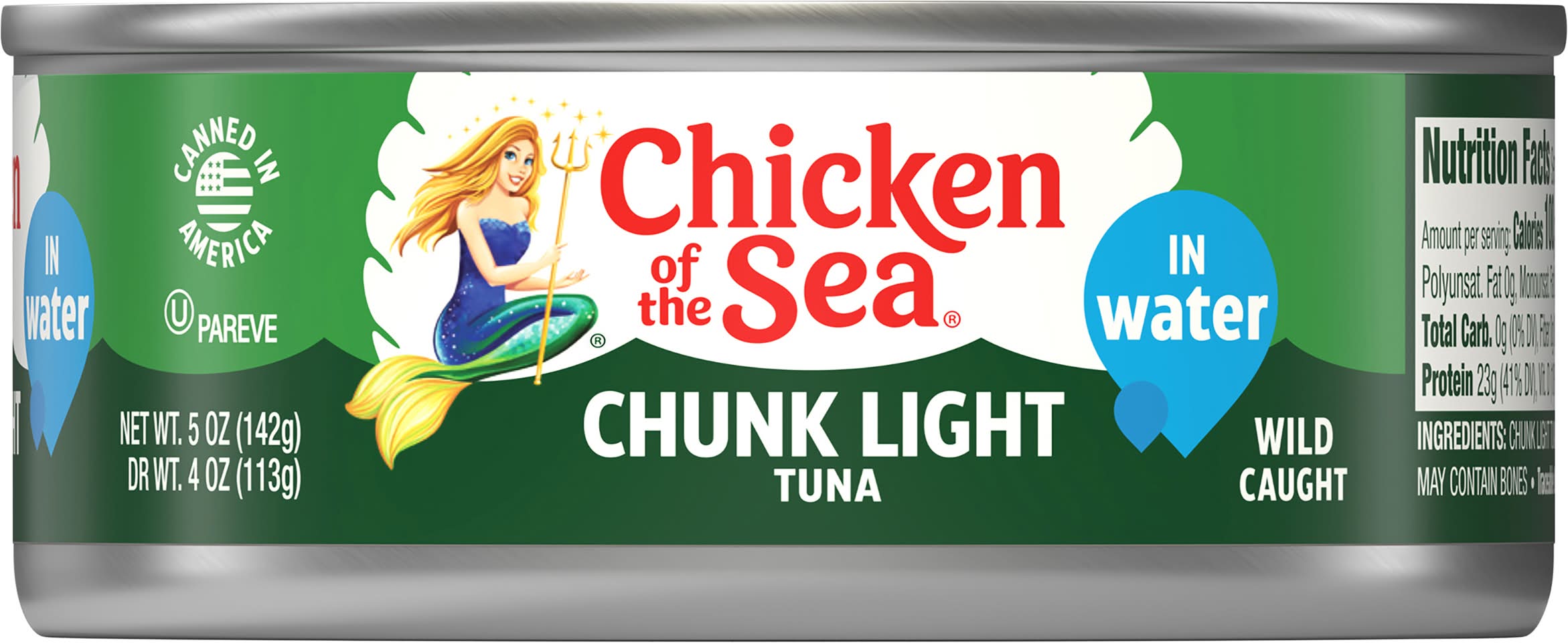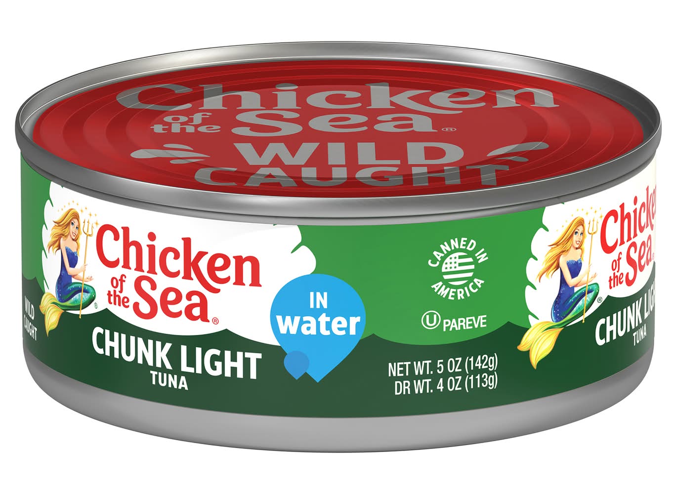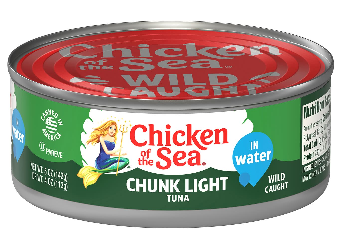 Dr wt. 4 oz (113 g). Wild caught. Dolphin safe. • Chicken of the Sea International, El Segundo, CA 90245 • Packaging: Reusable