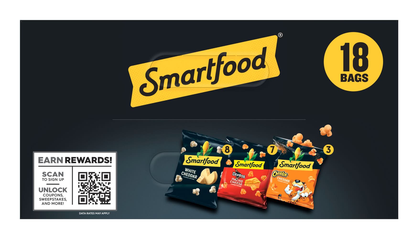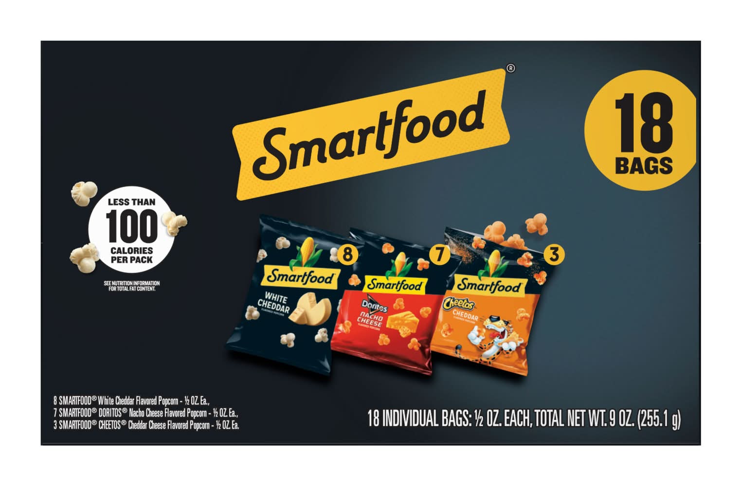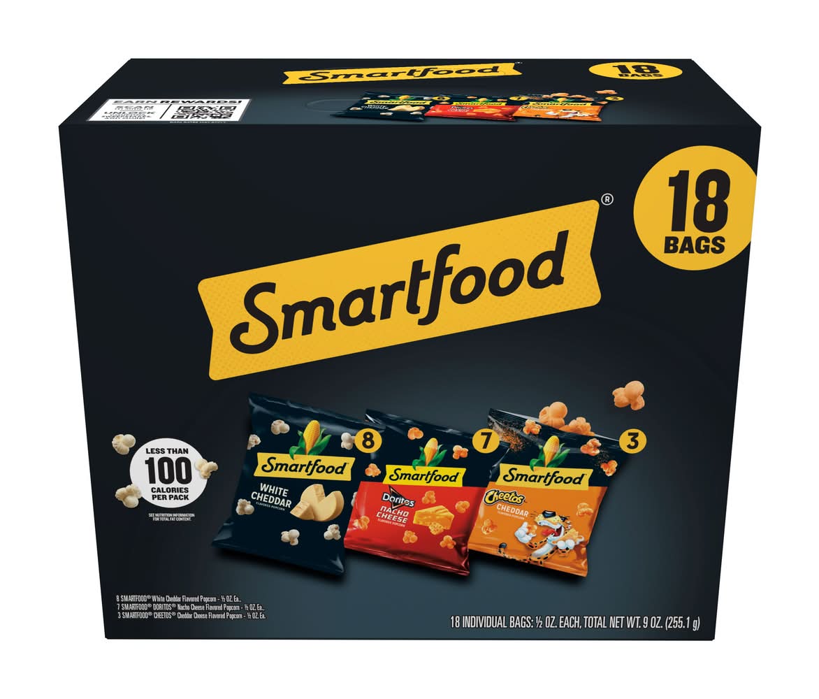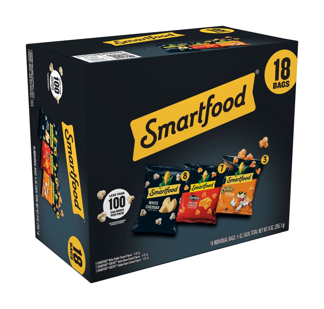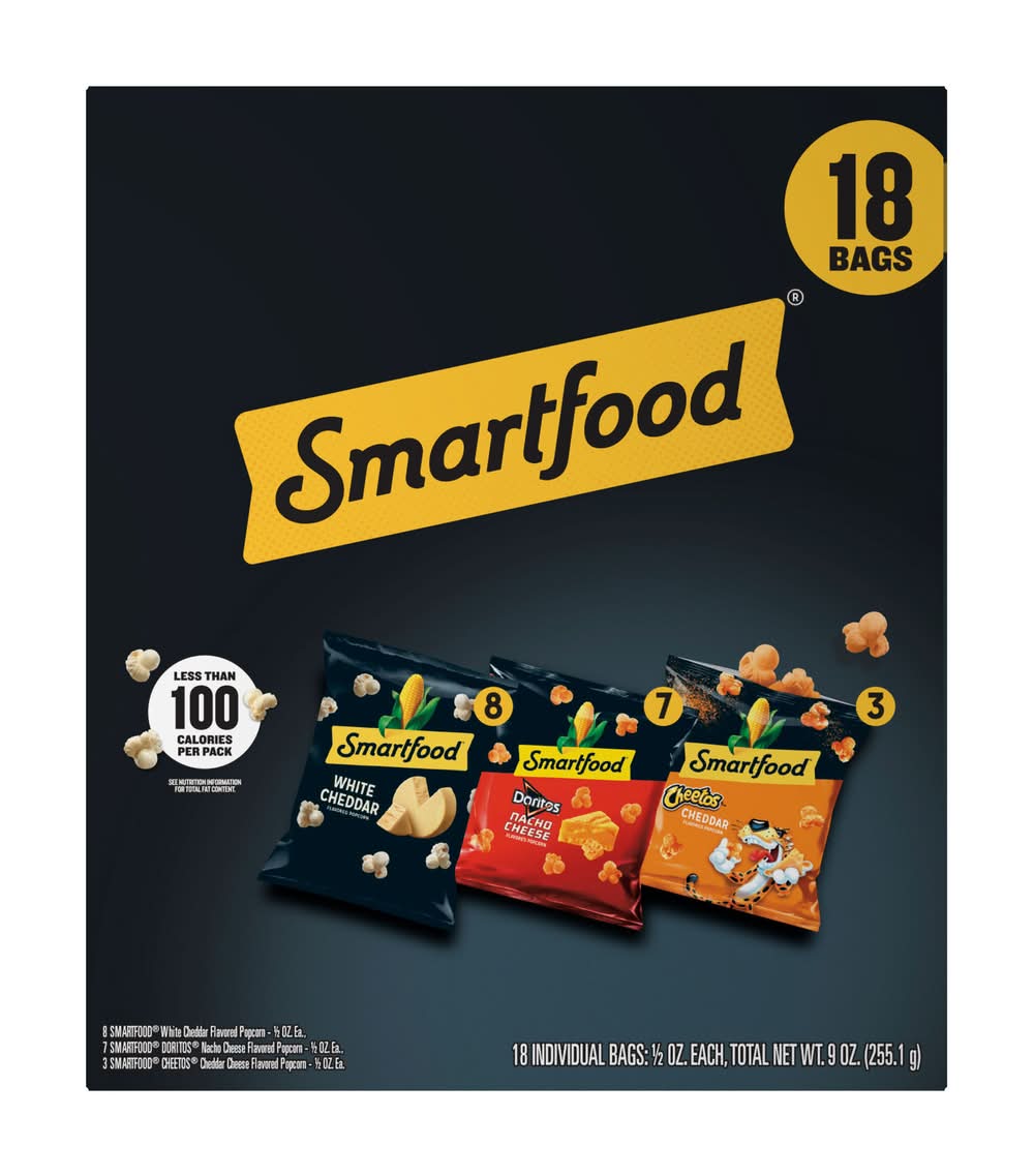 As America's favorite popcorn brand, our fresh-tasting, light-textured SMARTFOOD varieties always seem to keep the fun popping. In our book, being smart is always in great taste. • Flavor: White cheddar-nacho cheese-cheddar cheese • Pack size: 18