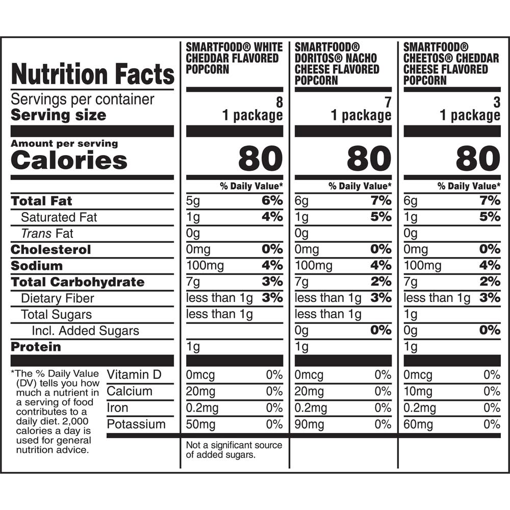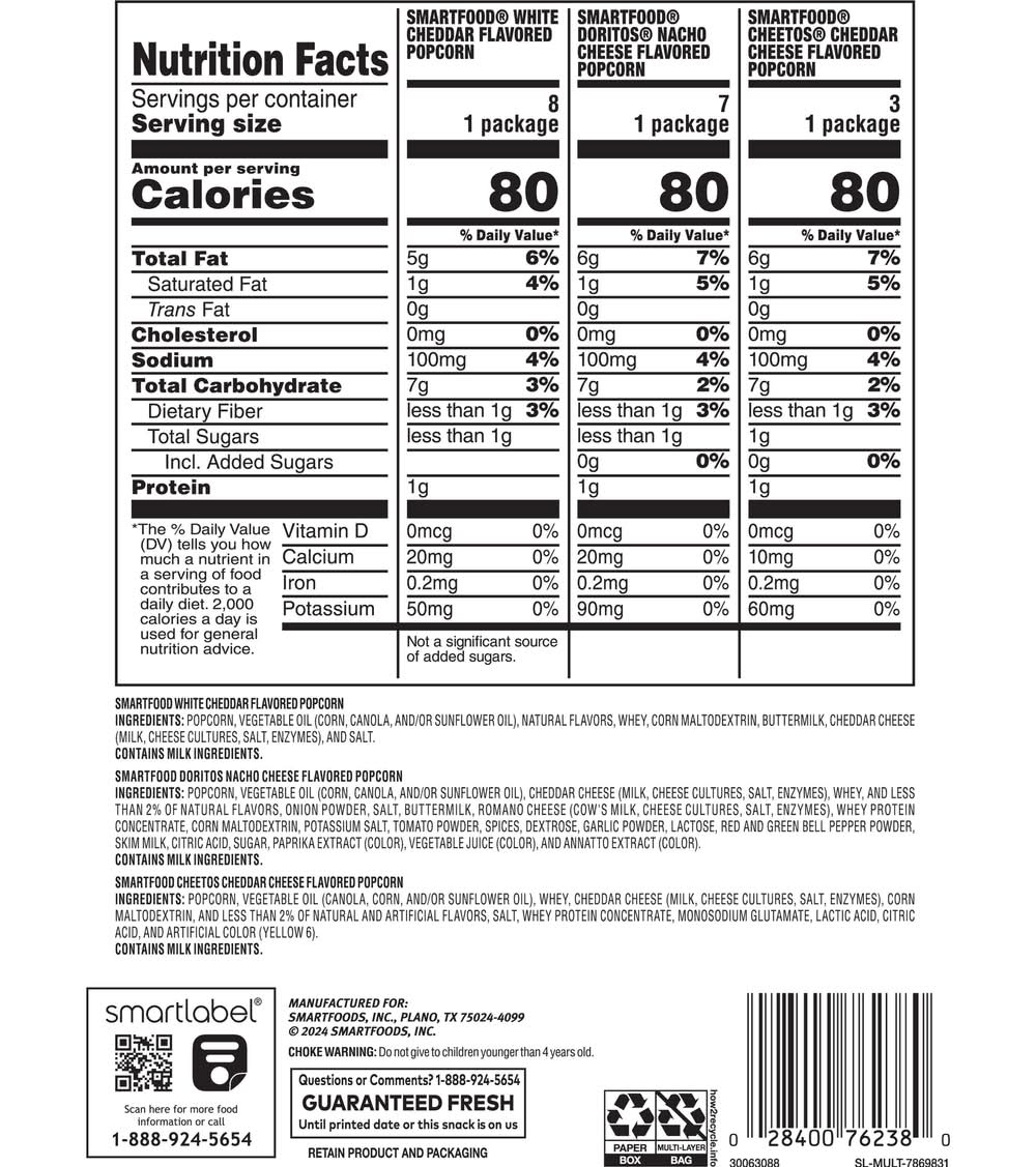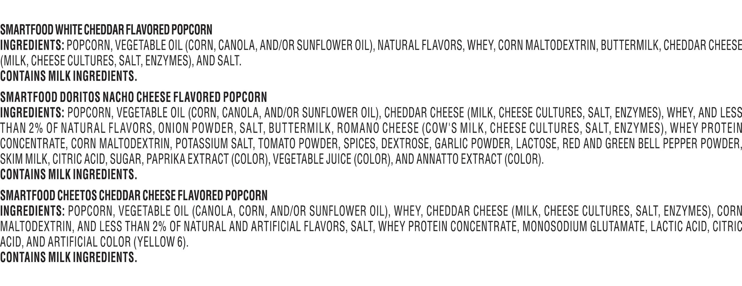 Ingredients: Smartfood White Cheddar Flavored Popcorn: Popcorn, Vegetable Oil (Corn, Canola, and/or Sunflower Oil), Natural Flavors, Whey, Corn Maltodextrin, Buttermilk, Cheddar Cheese (Milk, Cheese Cultures, Salt, Enzymes), and Salt. Smartfood Doritos Nacho Cheese Flavored Popcorn: Popcorn, Vegetable Oil (Corn, Canola, and/or Sunflower Oil), Cheddar Cheese (Milk, Cheese Cultures, Salt, Enzymes), Whey, and Less than 2% of Natural Flavors, Onion Powder, Salt, Buttermilk, Romano Cheese (Cow's Milk, Cheese Cultures, Salt, Enzymes), Whey Protein Concentrate, Corn Maltodextrin, Potassium Salt, Tomato Powder, Spices, Dextrose, Garlic Powder, Lactose, Red and Green Bell Pepper Powder, Skim Milk, Citric Acid, Sugar, Paprika Extract (Color), Vegetable Juice (Color), and Annatto Extract (Color). Smartfood Cheetos Cheddar Cheese Flavored Popcorn: Popcorn, Vegetable Oil (Canola, Corn, and/or Sunflower Oil), Whey, Cheddar Cheese (Milk, Cheese Cultures, Salt, Enzymes), Corn Maltodextrin, and Less than 2% of Natural and Artificial Flavors, Salt, Whey Protein Concentrate, Monosodium Glutamate, Lactic Acid, Citric Acid, and Artificial Color (Yellow 6). Contains: Milk, Lactose