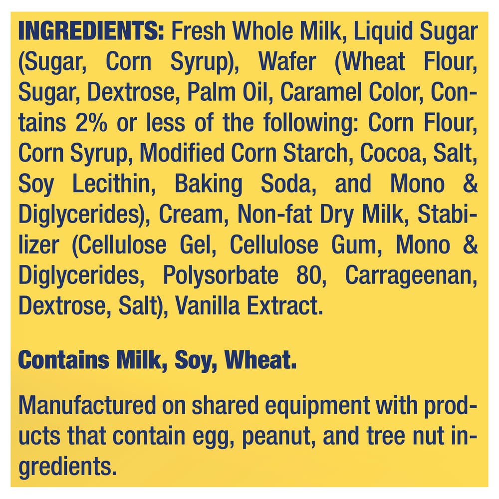 Ingredients: Fresh Whole Milk, Liquid Sugar (Sugar, Corn Syrup), Wafer (Wheat Flour, Sugar, Dextrose, Palm Oil, Caramel Color, Contains 2% or Less of the Following: Corn Flour, Corn Syrup, Modified Corn Starch, Cocoa, Salt, Soy Lecithin, Baking Soda, Mono & Diglycerides), Cream, Non-Fat Dry Milk, Stabilizer (Cellulose Gel, Cellulose Gum, Mono & Diglycerides, Polysorbate 80, Carrageenan, Dextrose, Salt), Vanilla Extract Contains: Milk, Soybeans, Wheat, Corn, Peanuts, Tree Nuts, Eggs
